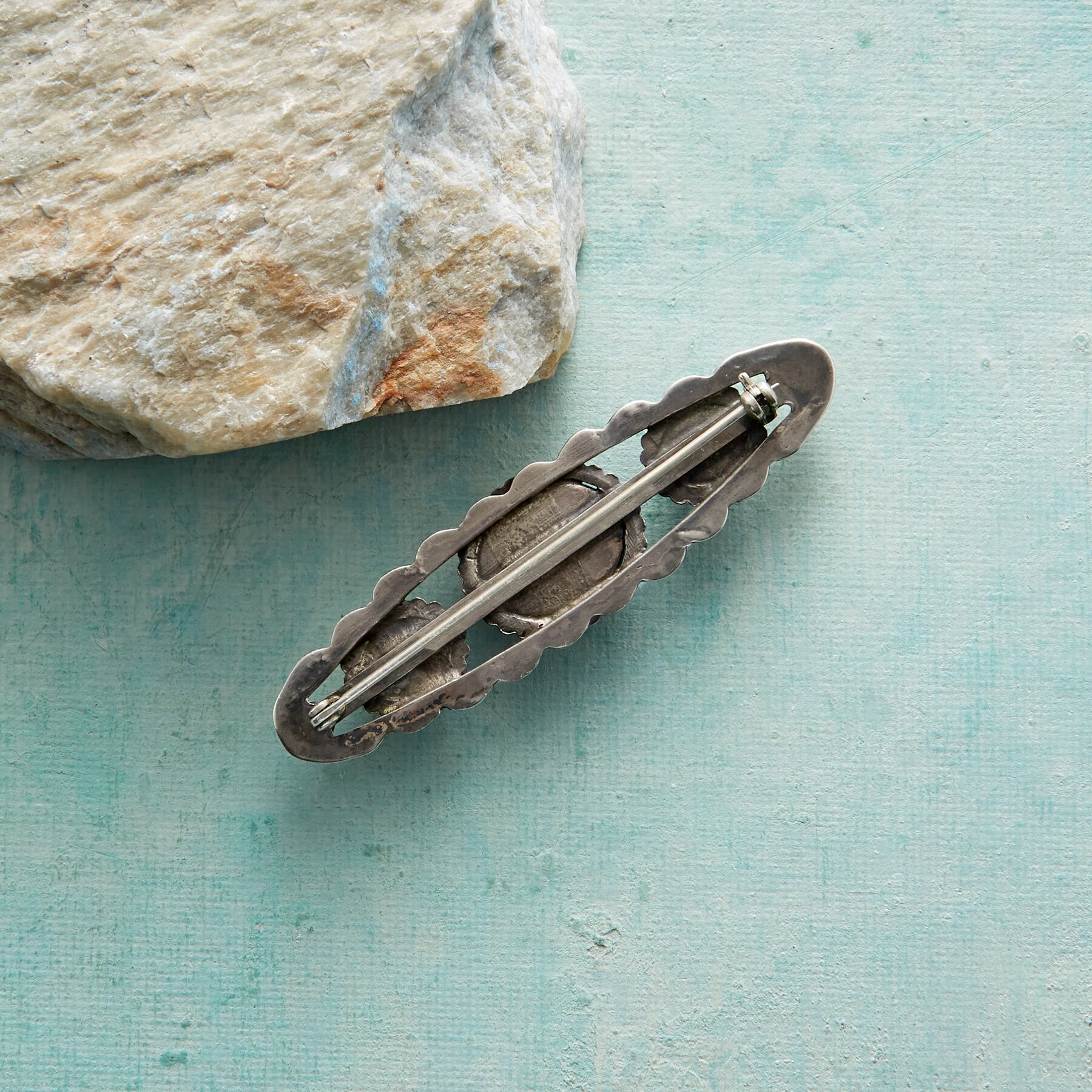 Over the decades the patina of this Navajo-made, sterling silver pin has mellowed, creating a stunning backdrop for Fox turquoise framed with bead balls. Hand-stamped scallops and arrows adorn the pin. One of a kind. Made in USA. Exclusive. 2-7/8″L x 3/4″W.