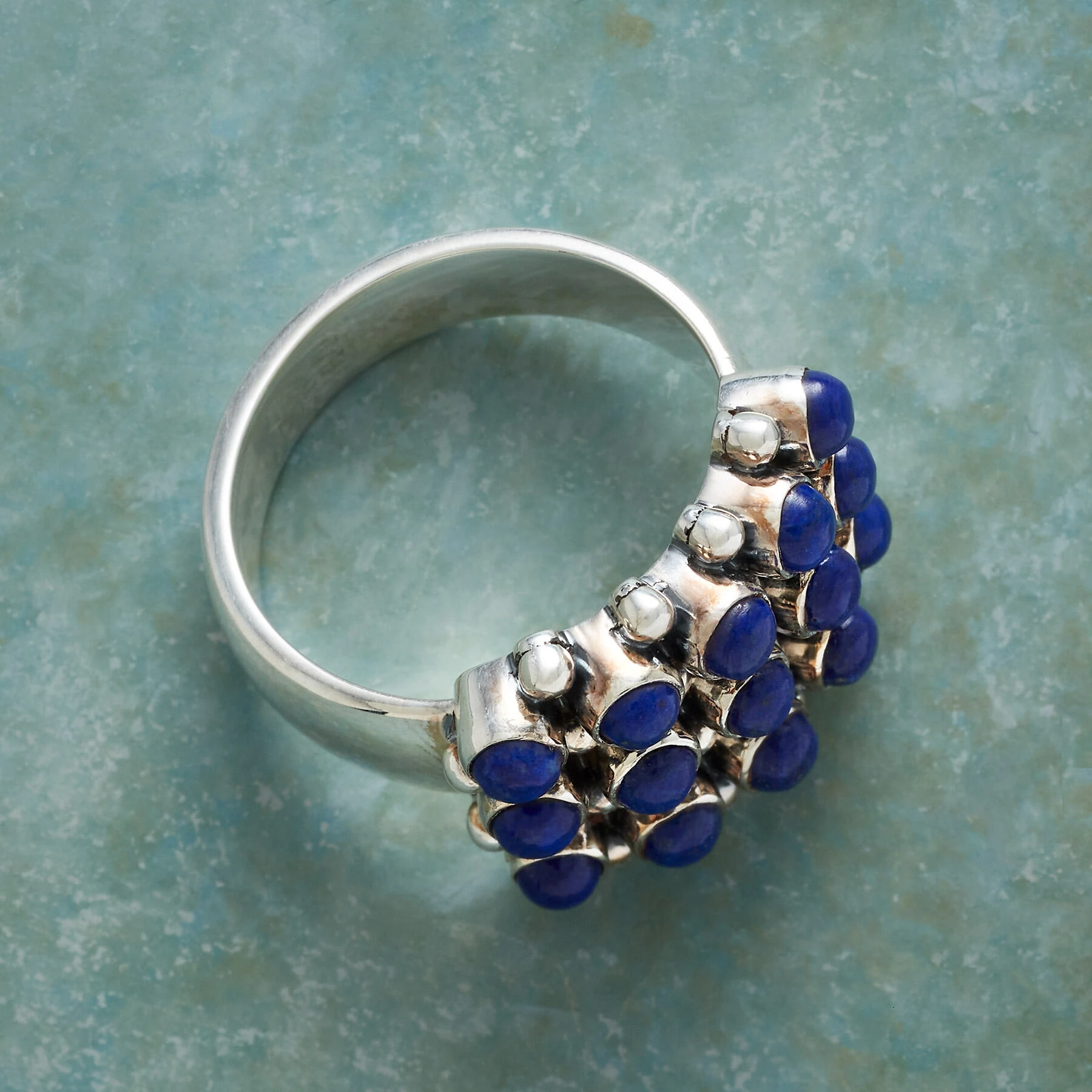Lapis lazuli cabochons in tidy formation crown the finger. Granulation beads dot each bezel; oxidation accentuates depth. Exclusive. Handmade of sterling silver. Whole sizes 5-10.