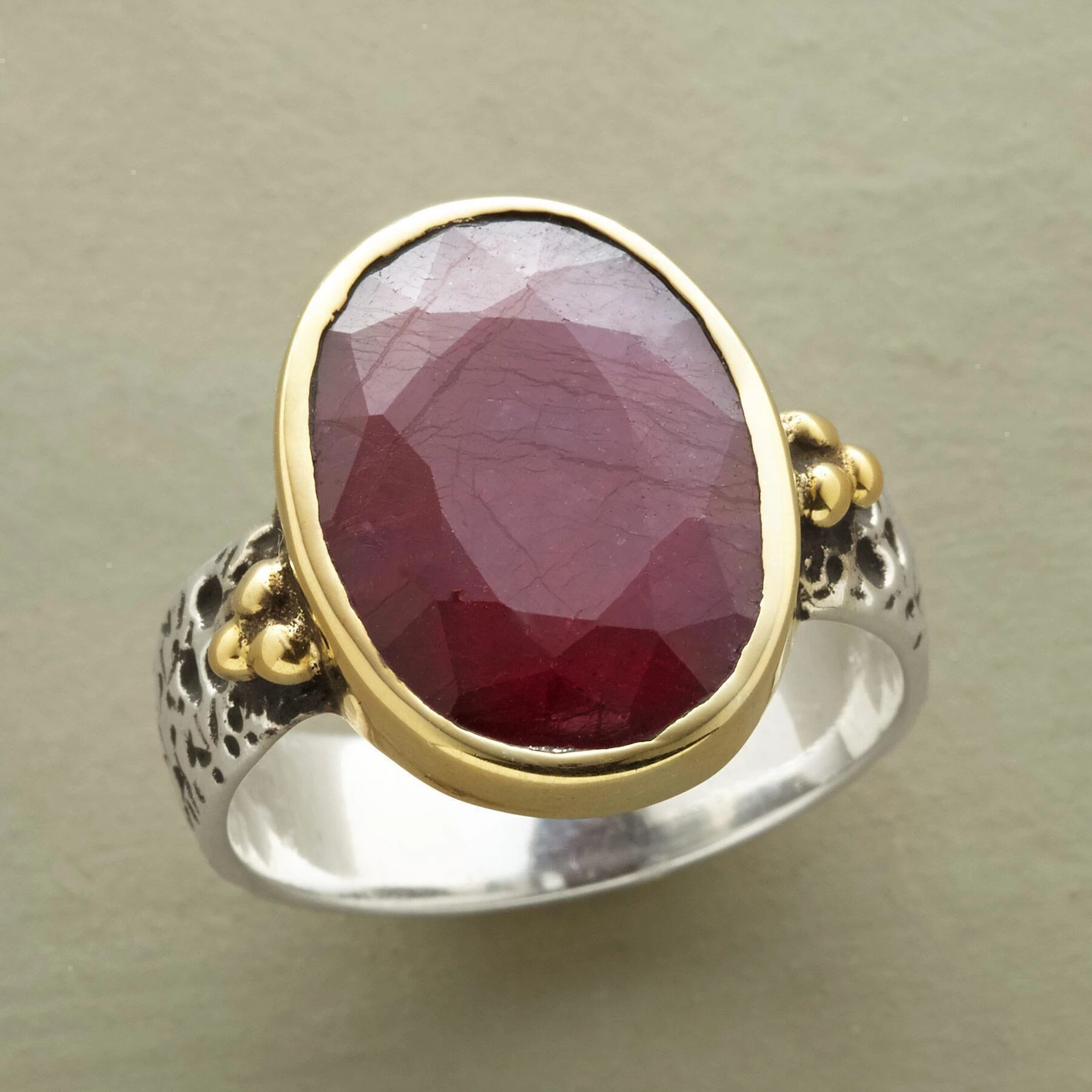 Hold court with a ring, set with ruby that glows from a 14kt gold plated bezel, on a hand worked sterling silver band. Exclusive. Whole sizes 5โ10.