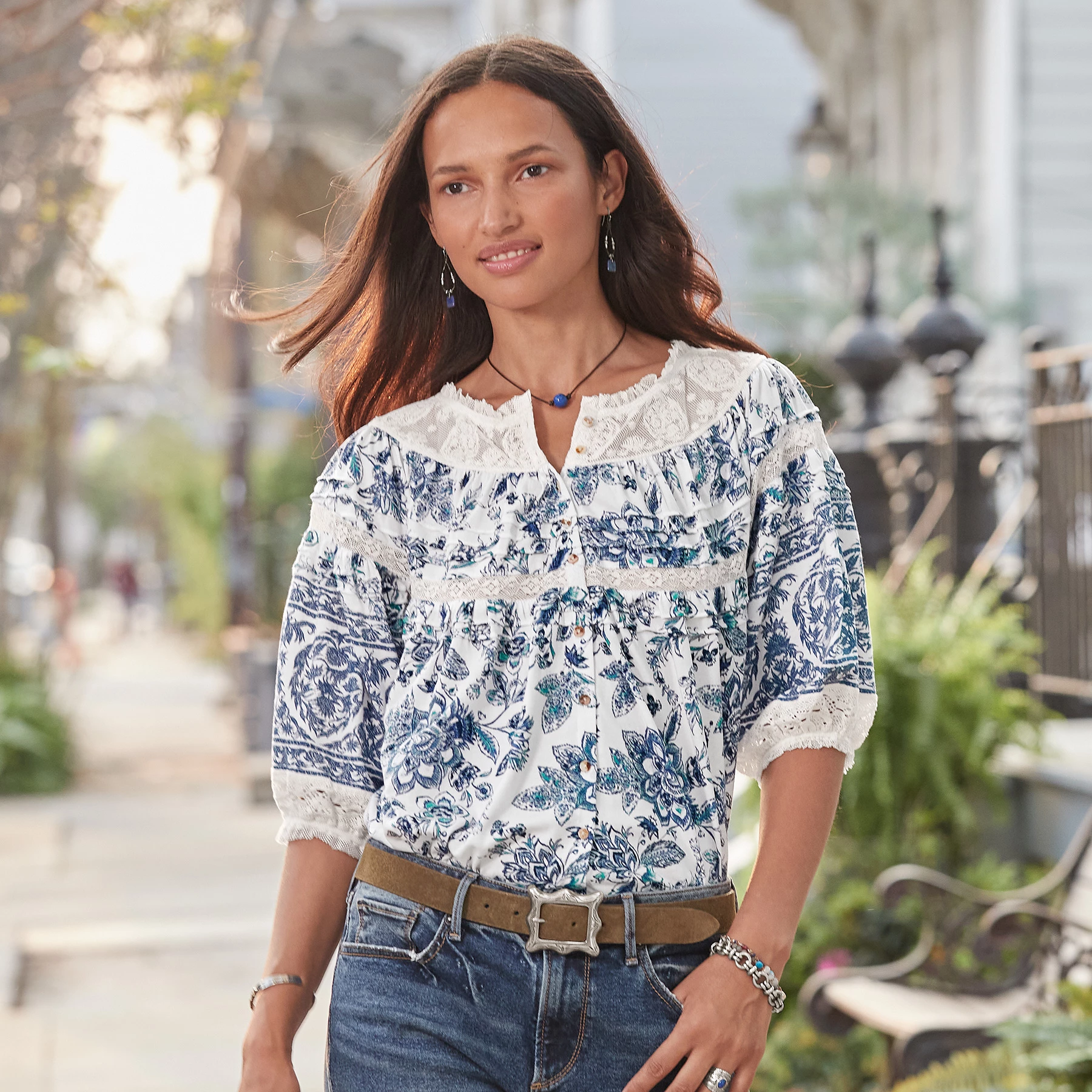 Soft, mixed print patterns with printed borders are enhanced with embroidered mesh and lace insets on our easy fit top with raw edge details, pin tucks and shell buttons. Full elbow length sleeves. Cotton/modal. Machine wash. Imported. Exclusive. Sizes XXS (00), XS (0–2), S (4–6), M (8–10), L (12–14), XL (16–18). Approx. 23″l.