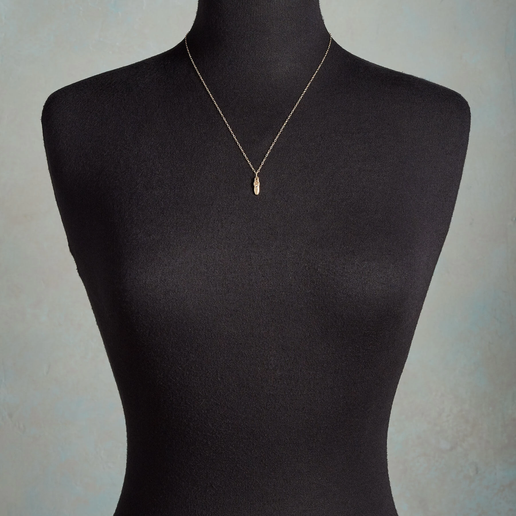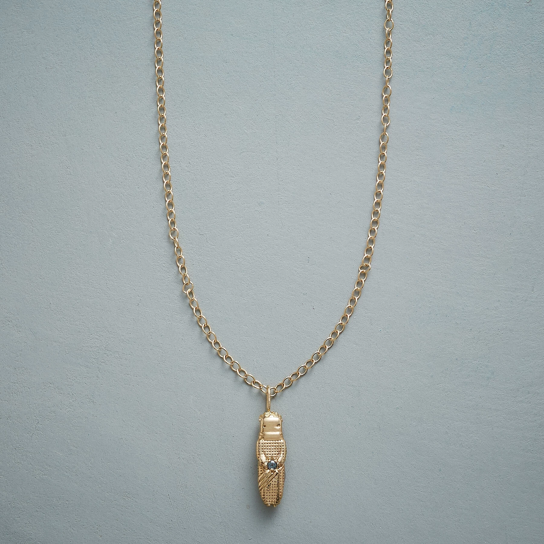 Whisper your worries and let this tiny “worry doll” whisk them away. B’atz represents the Mayan spirit of destiny, its hands holding a gleaming alexandrite. Handmade of 14kt gold; spring ring clasp. 20″L.