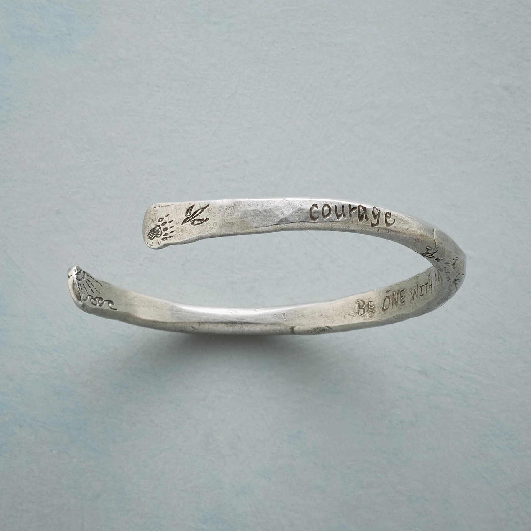 Jes MaHarry inscribes our weighty, hand-hammered pewter cuff bracelet with moons, stars, mountains and the inspiring words “be one with nature” and “courage.” Handmade in USA, Exclusive. 2-5/8″ dia.