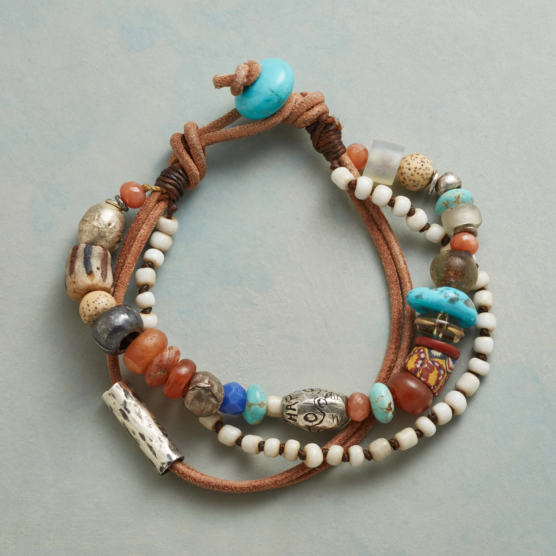 Treasures sought and found in a handcrafted leather bracelet combines the rugged beauty of turquoise, feldspar, sterling silver, brass, white pony and trade beads. Leather loop closure. By Jes MaHarry. USA. Exclusive. Approx. 8-1/2″L. ย