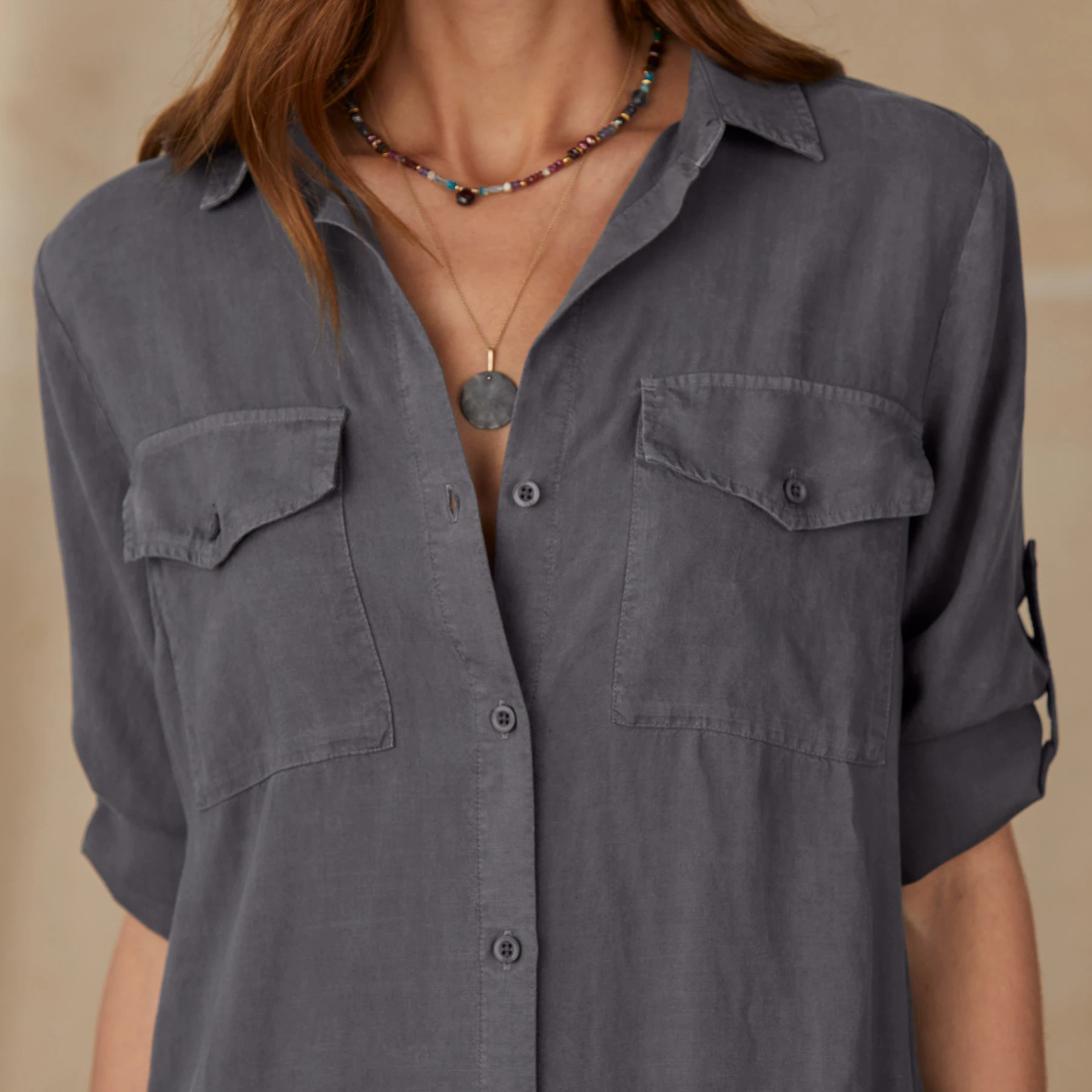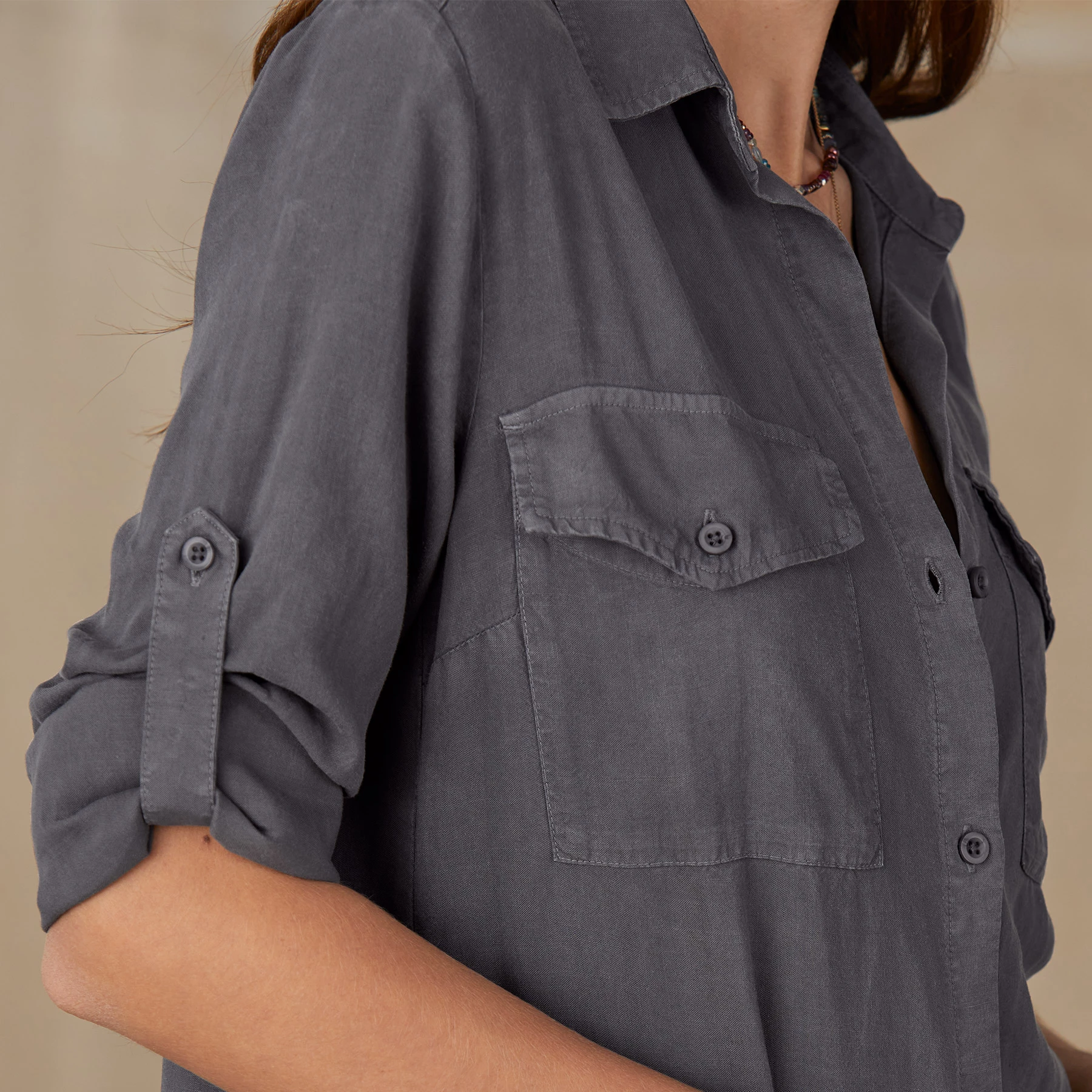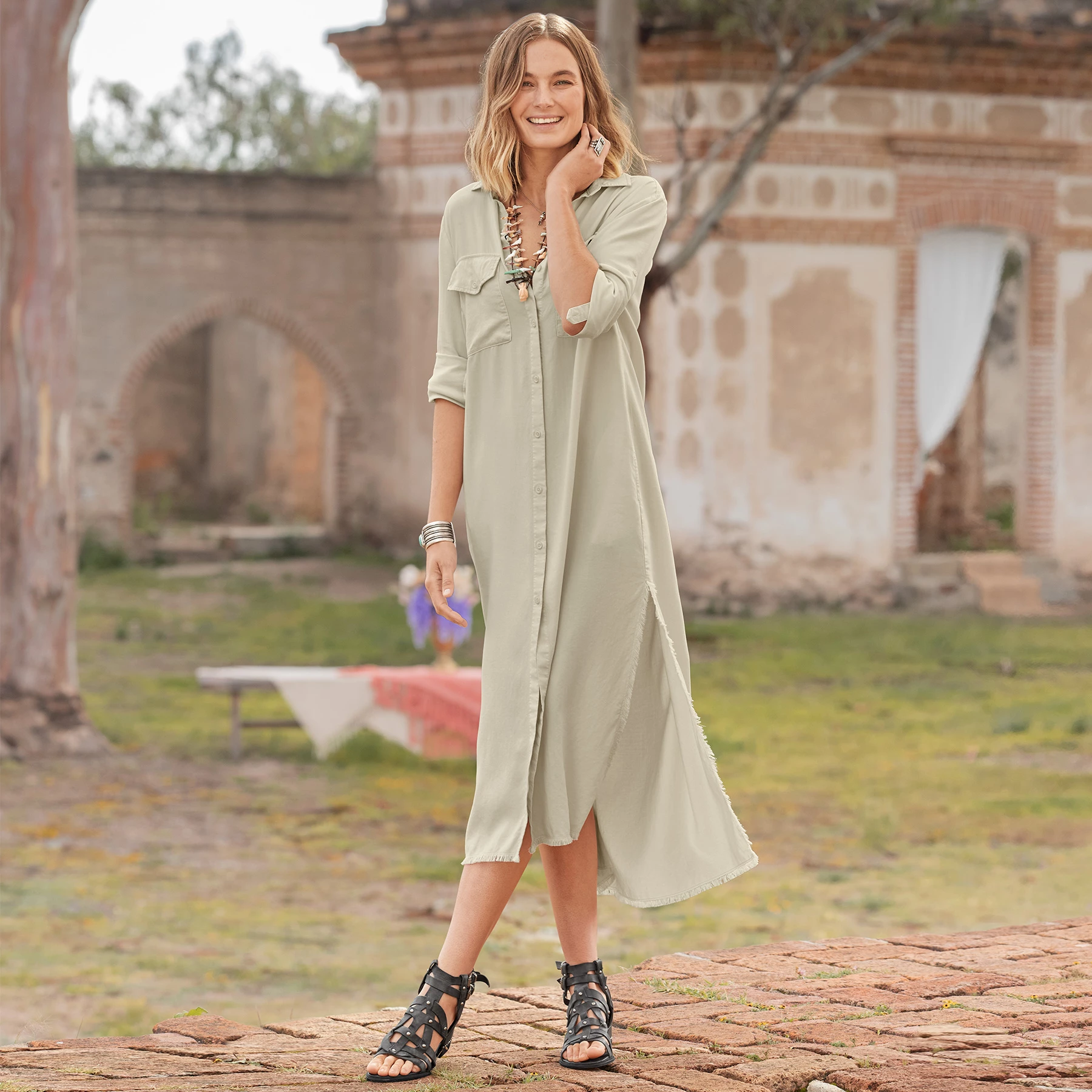 A button-front shirt dress in beautifully flowing Tencelยฎ. Two on-seam pockets, two chest pockets, high side slits, roll-tab sleeves. Machine wash. Imported. Sizes XS (0 to 2), S (4 to 6), M (8 to 10), L (12 to 14), XL (16 to 18). Approx. 50-1/2″L.