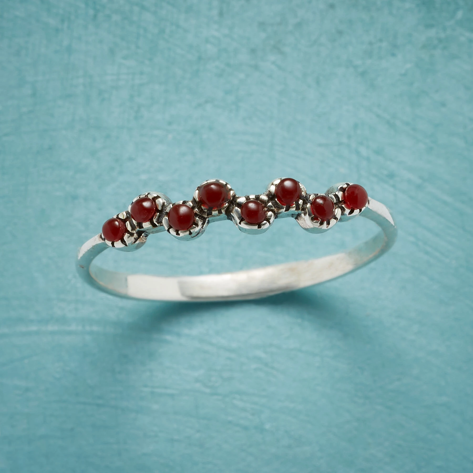 Kissed with eight tiny carnelians, our slim sterling silver band is dainty on its own and perfect for stacking. Handcrafted. Whole sizes 5-10.