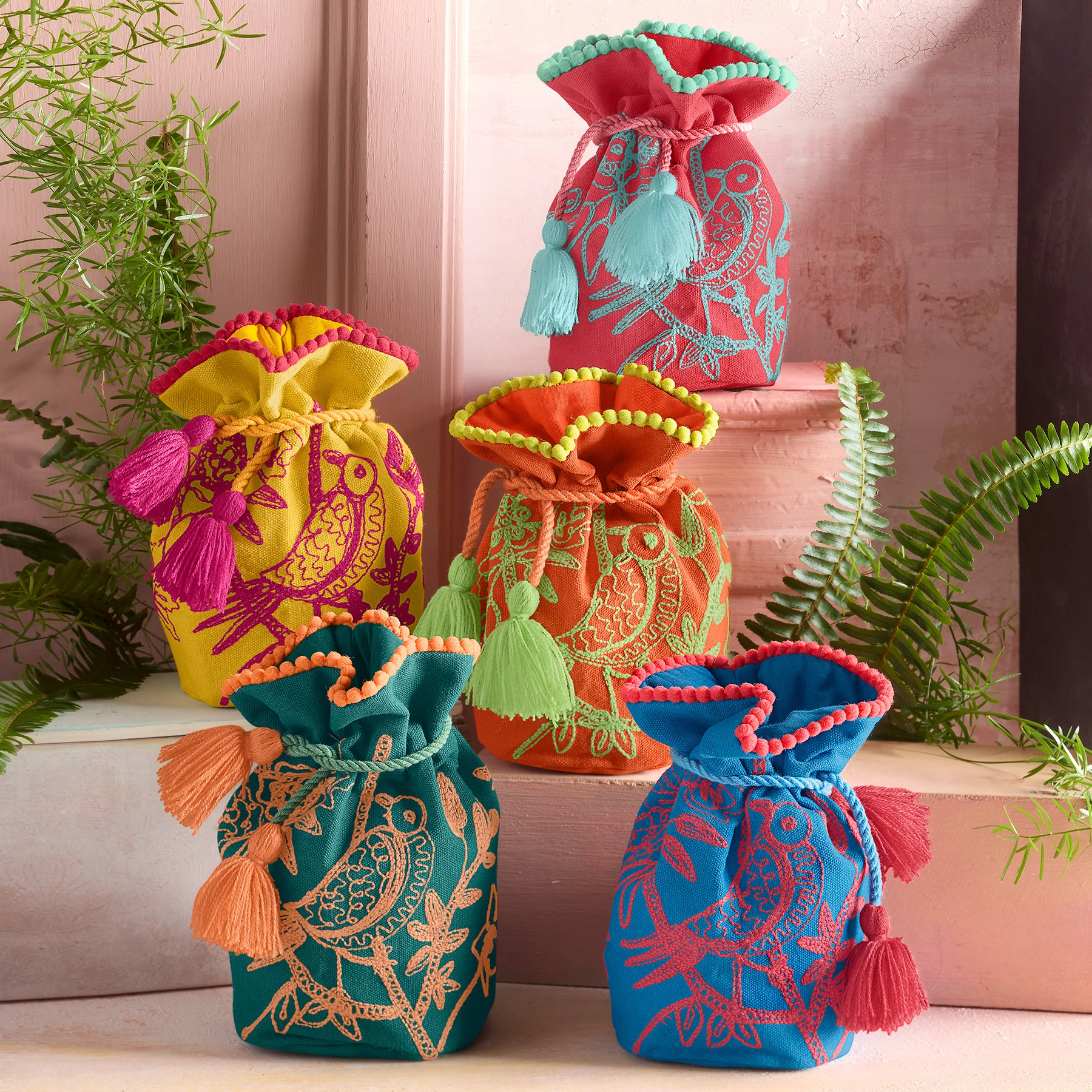 Embroidered with birds on blooming branches, our cotton canvas jewelry keepers are as bright and beautiful as they are useful. Each drawstring pouch offers ample room for baubles and bangles, plus slip pockets around the interior to organize studs, rings and other small treasures. Trimmed with mini ball fringe. Imported. Exclusive. 7-1/2″h x 4-1/2″ dia.
