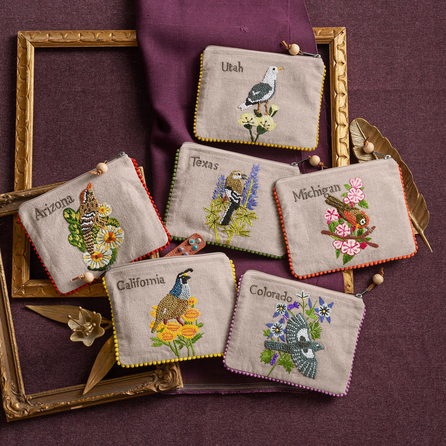 Hand embroidered state birds perch on a soft cotton jewelry pouch bordered with petite pom poms and complete with a snapped, perforated leather strap inside to keep earrings, necklaces and bracelets in place. Zipped main compartment. 8-1/4″H x 6-1/2″L.