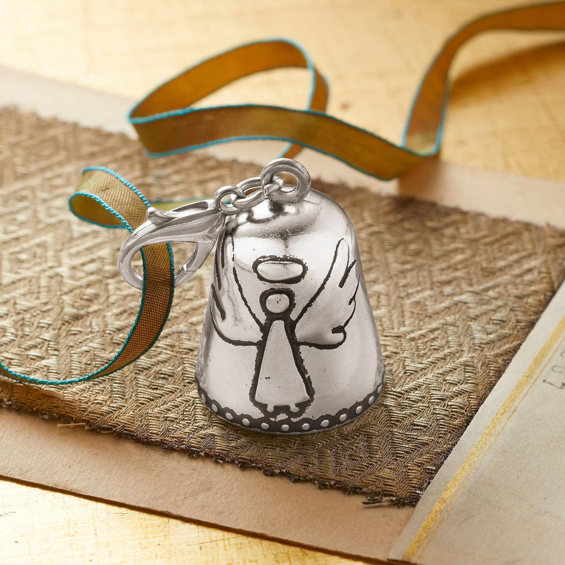 This tiny, silver-colored bell comes in a soft, organza bag with a card that tells the Blessing Bell story. Clip to a purse, keys, or carry in a pocket to bring good luck. Debossed with the words “Someone To Watch Over Me.” Lobster clasp. Zinc alloy. Imported. 2-1/4″L x 1″ dia.