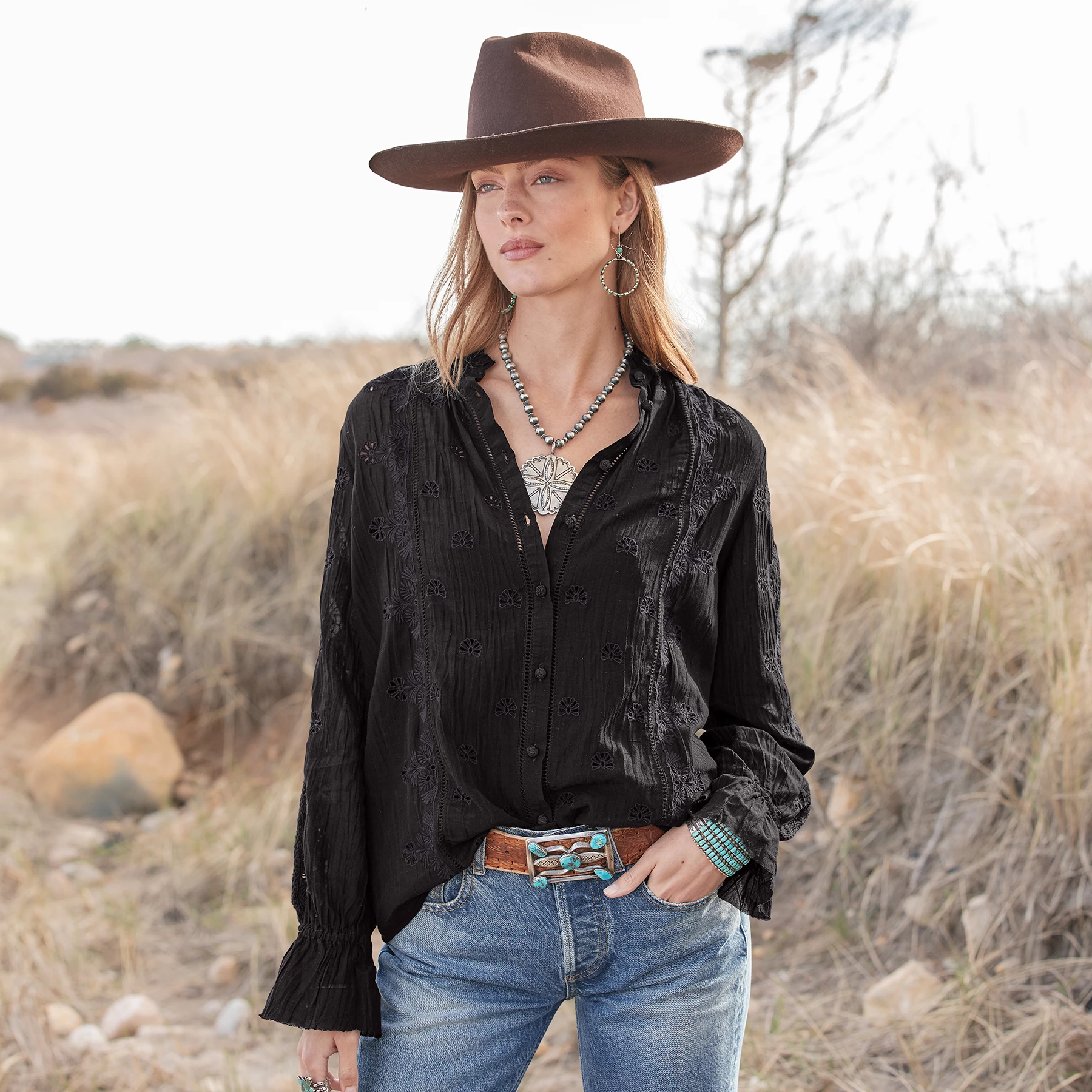 Allover floral embroidery graces our artistic ruffle sleeve top with shirring and ladder lace detail. Cotton/viscose. Hand wash. Imported. Exclusive. Sizes XS (0 to 2), S (4 to 6), M (8 to 10), L (12 to 14), XL (16 to 18), XXL (20 to 22). Approx. 26-1/2″L.