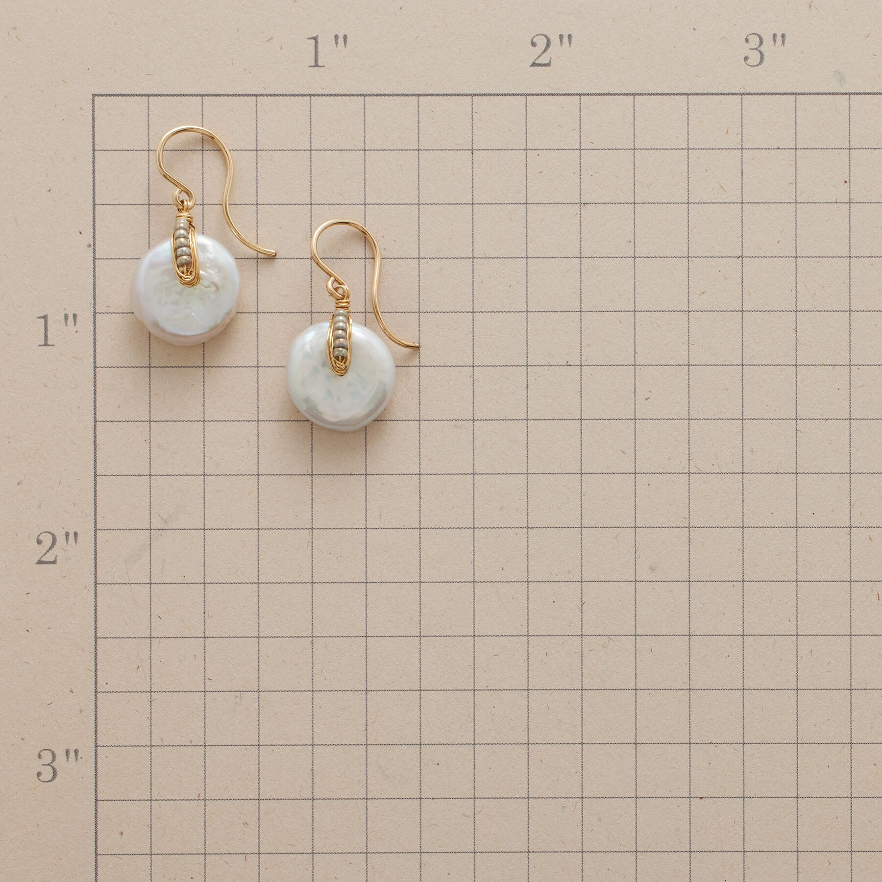 Buttons of freshwater pearl are accented with petite seed pearls and intricate wire wrapping in Dana Kellin’s handcrafted 14kt gold-filled earrings. French wires. Made in USA. 1″L.