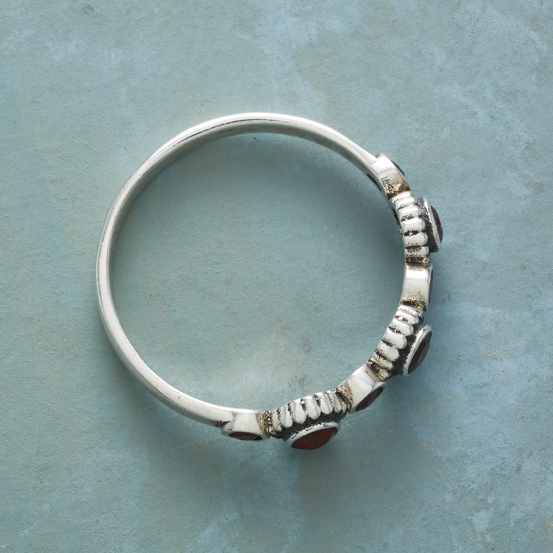 Seven garnets in two sizes keep time ’round this sterling silver ring. Designed to shine alone or stacked with other favorites. Handcrafted. Whole sizes 5-10.