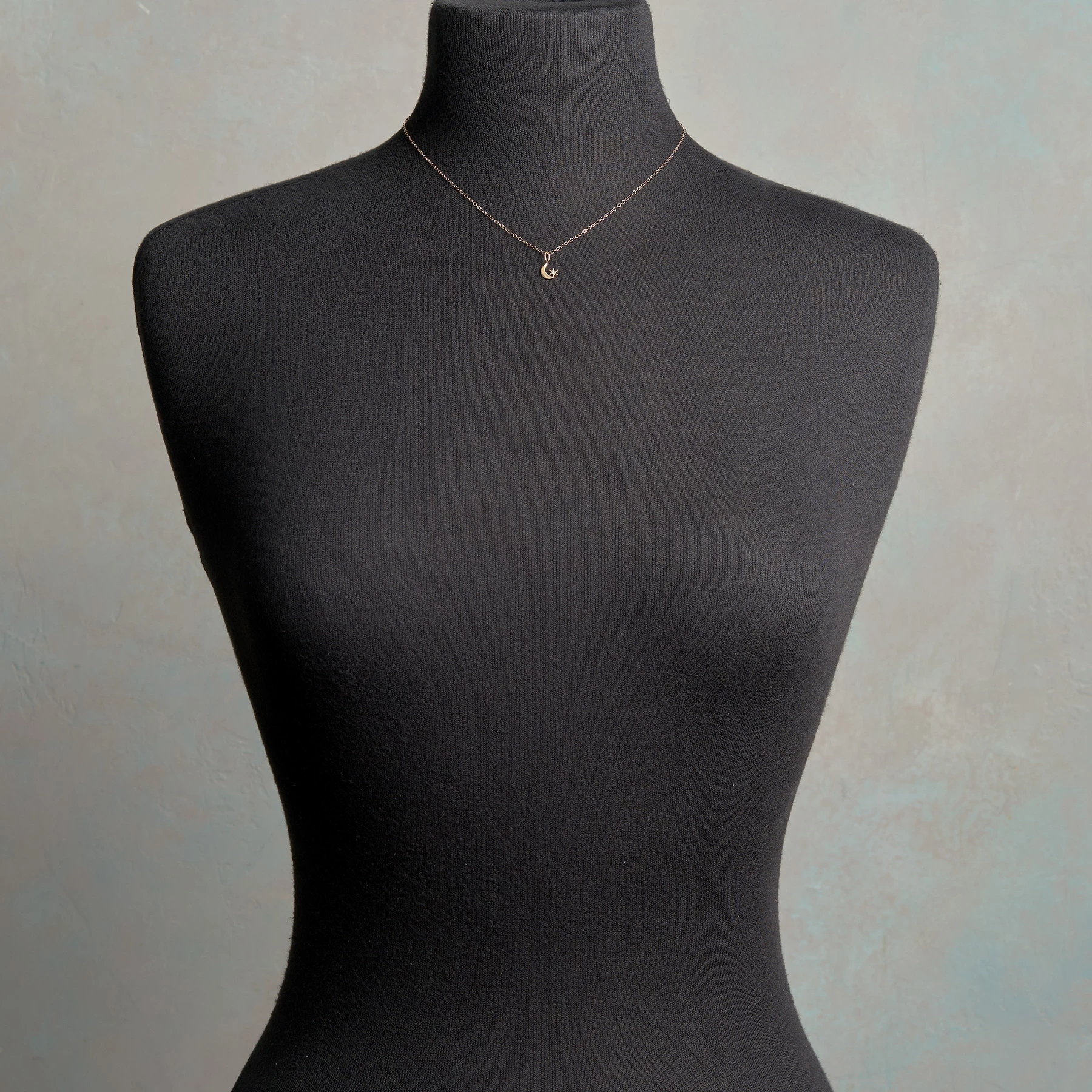 A diamond-kissed star perches on the tip of a crescent moon, a rare celestial moment and an ancient symbol of growth. Handmade in the USA of 14kt gold by Nicole McIver. Lobster clasp. 16″L.