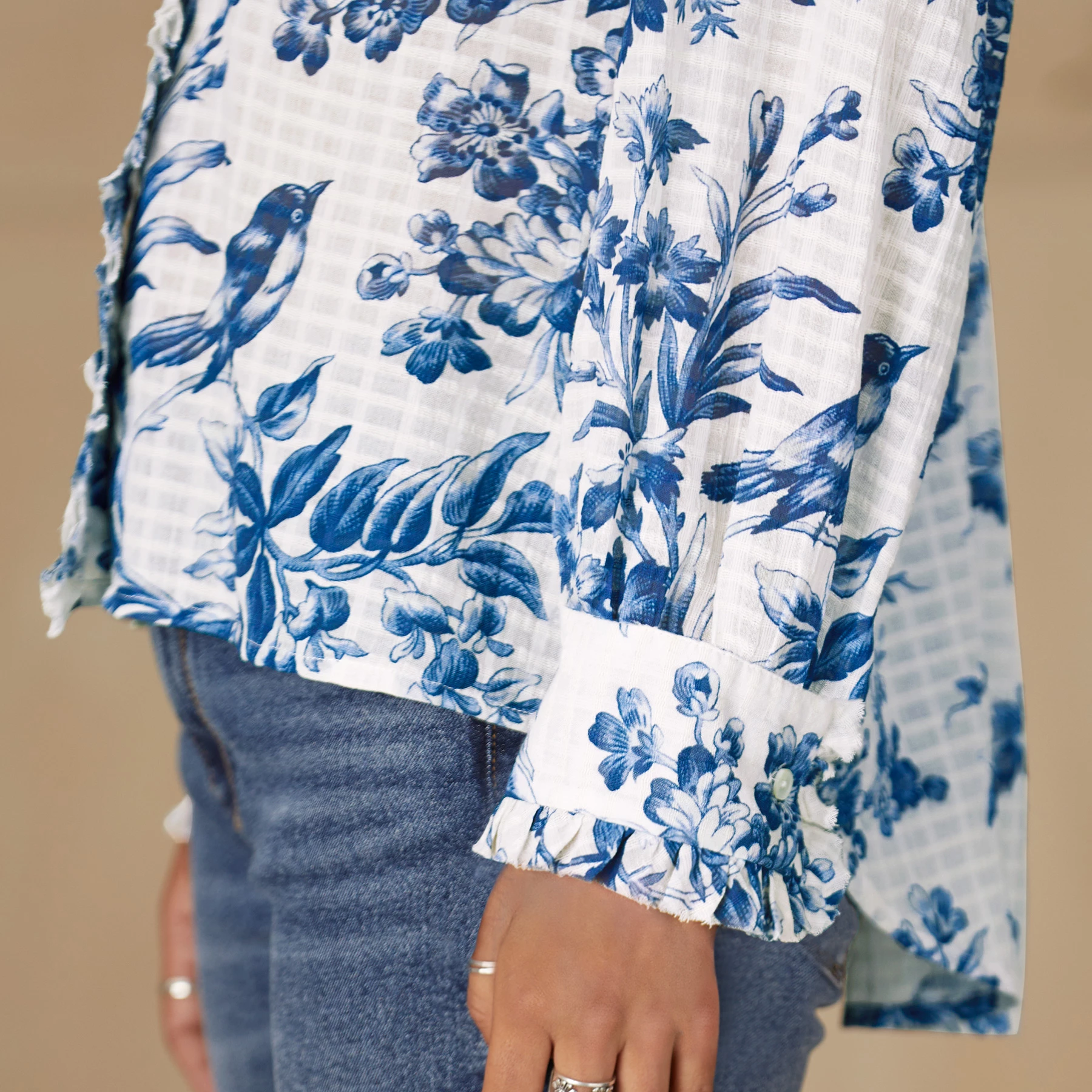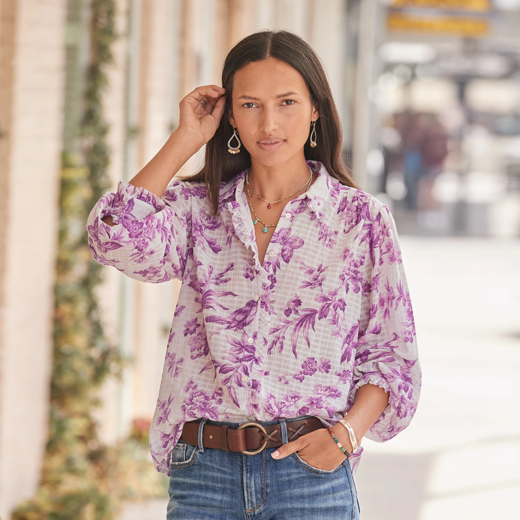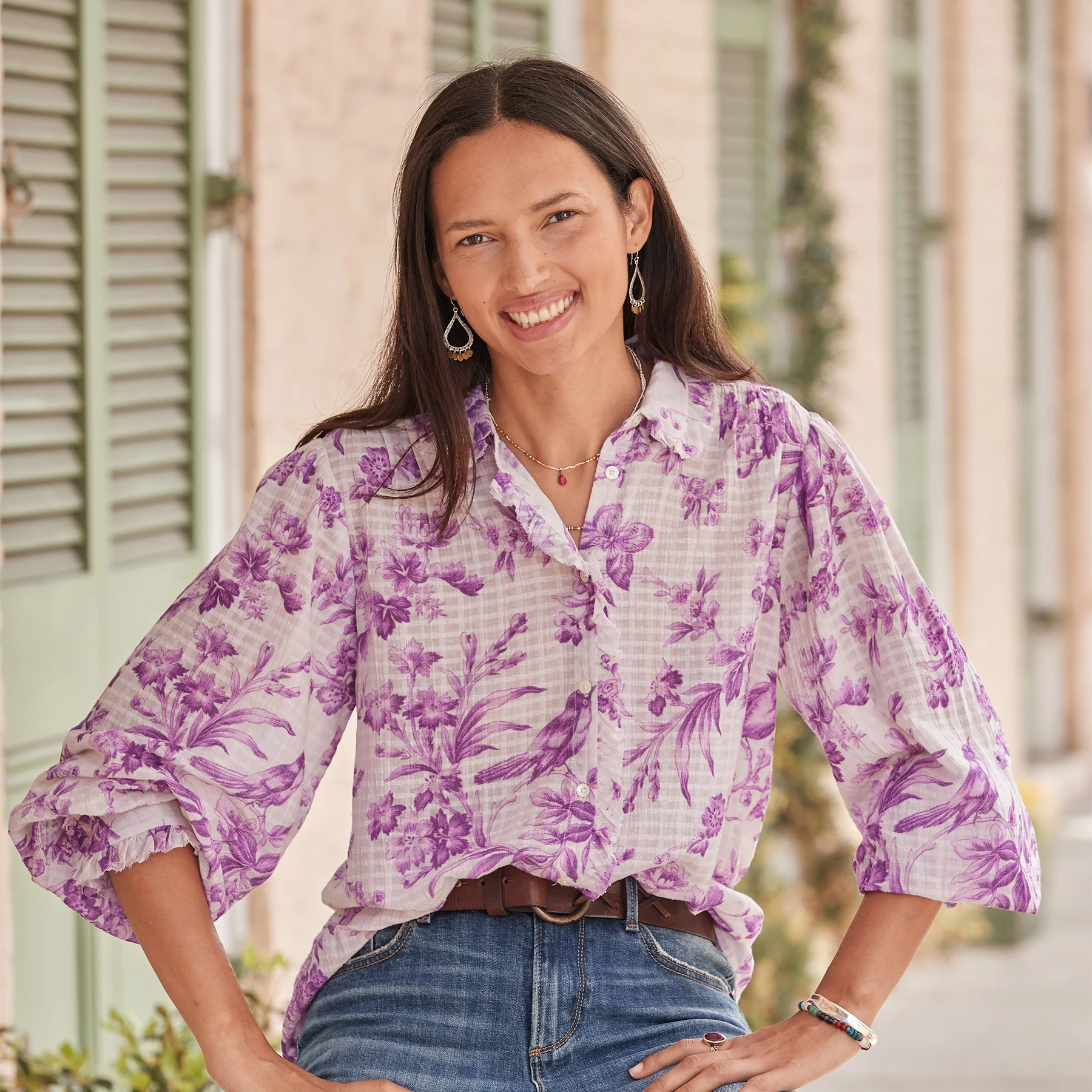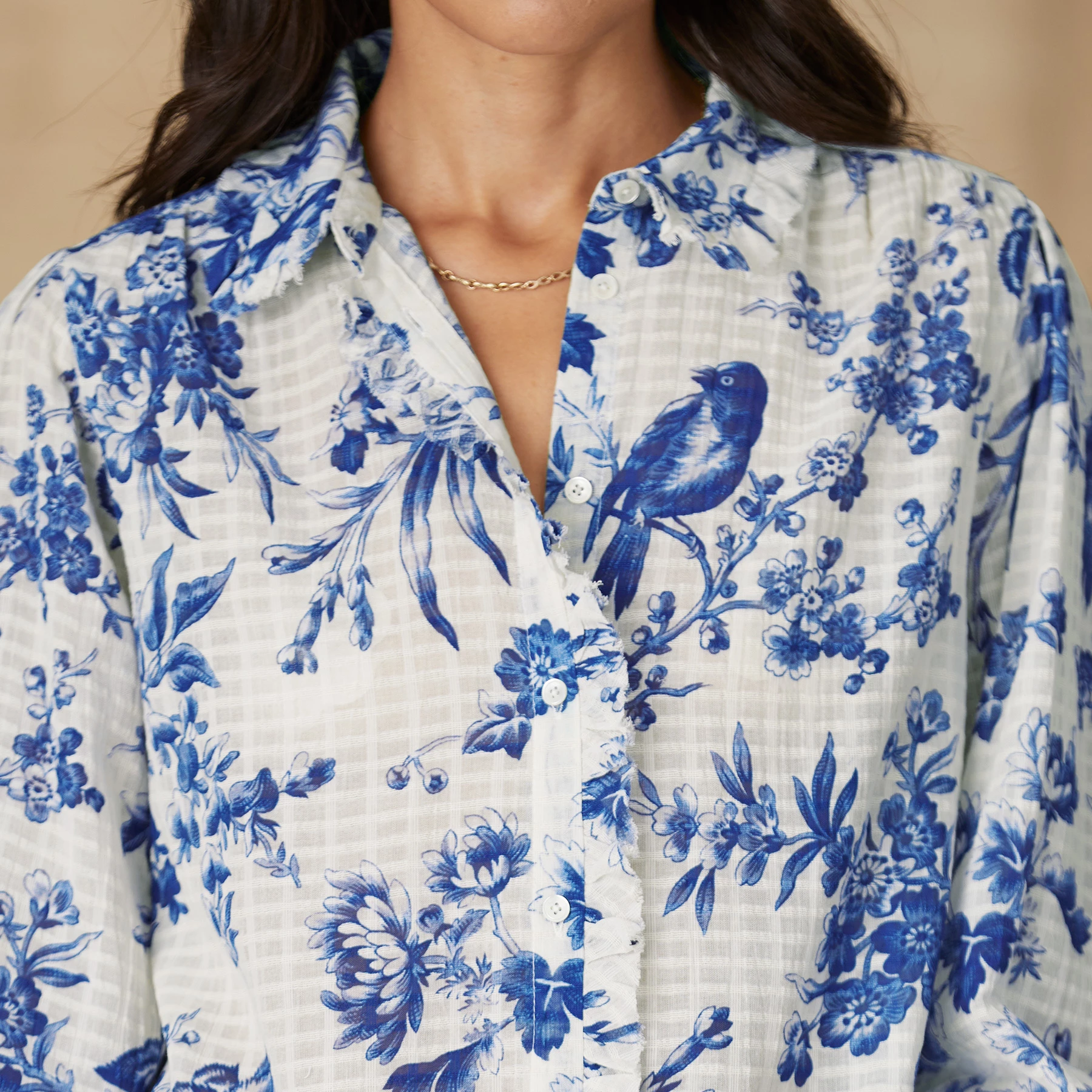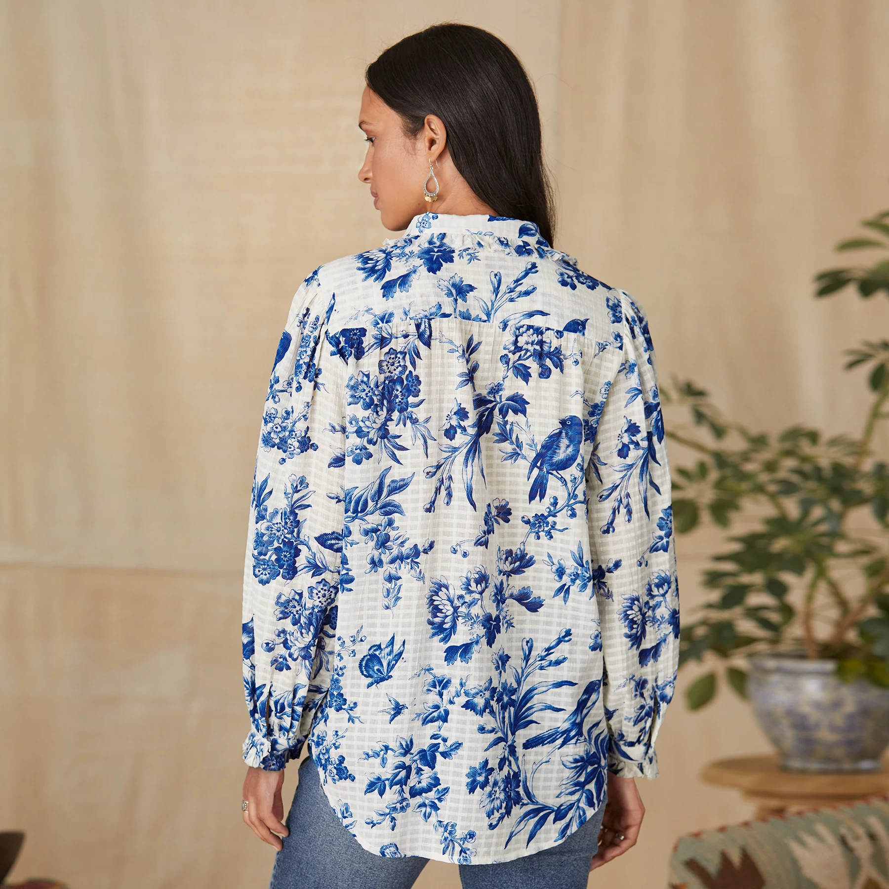 Button-front, windowpane cotton with a beautiful toile-inspired print featuring birds, butterflies and florals. Easy-fit and flowing, with Peter Pan collar, raw-edge ruffle detail at neckline and center front, subtle blouson sleeves, hi-lo hem. Machine wash. Imported. Exclusive. Sizes XS (0–2), S (4–6), M (8–10), L (12–14), XL (16–18), XXL (20–22). Approx. 25″l.