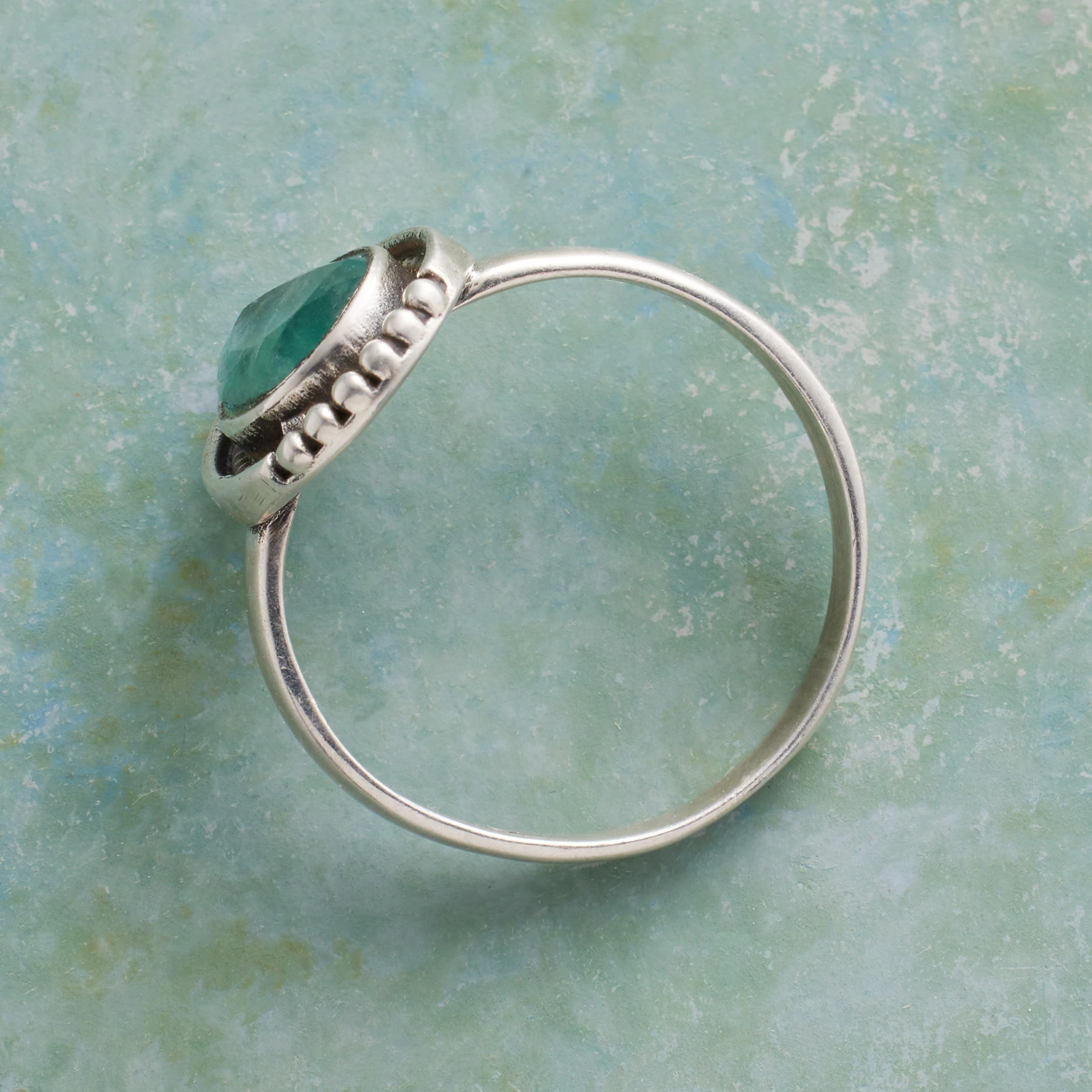 A beaded setting of sterling silver surrounds a dramatic pear-cut apatite, lending this ring tailored style and the presence of a signature piece. Simple half-round band. Handcrafted. Whole sizes 5-10.