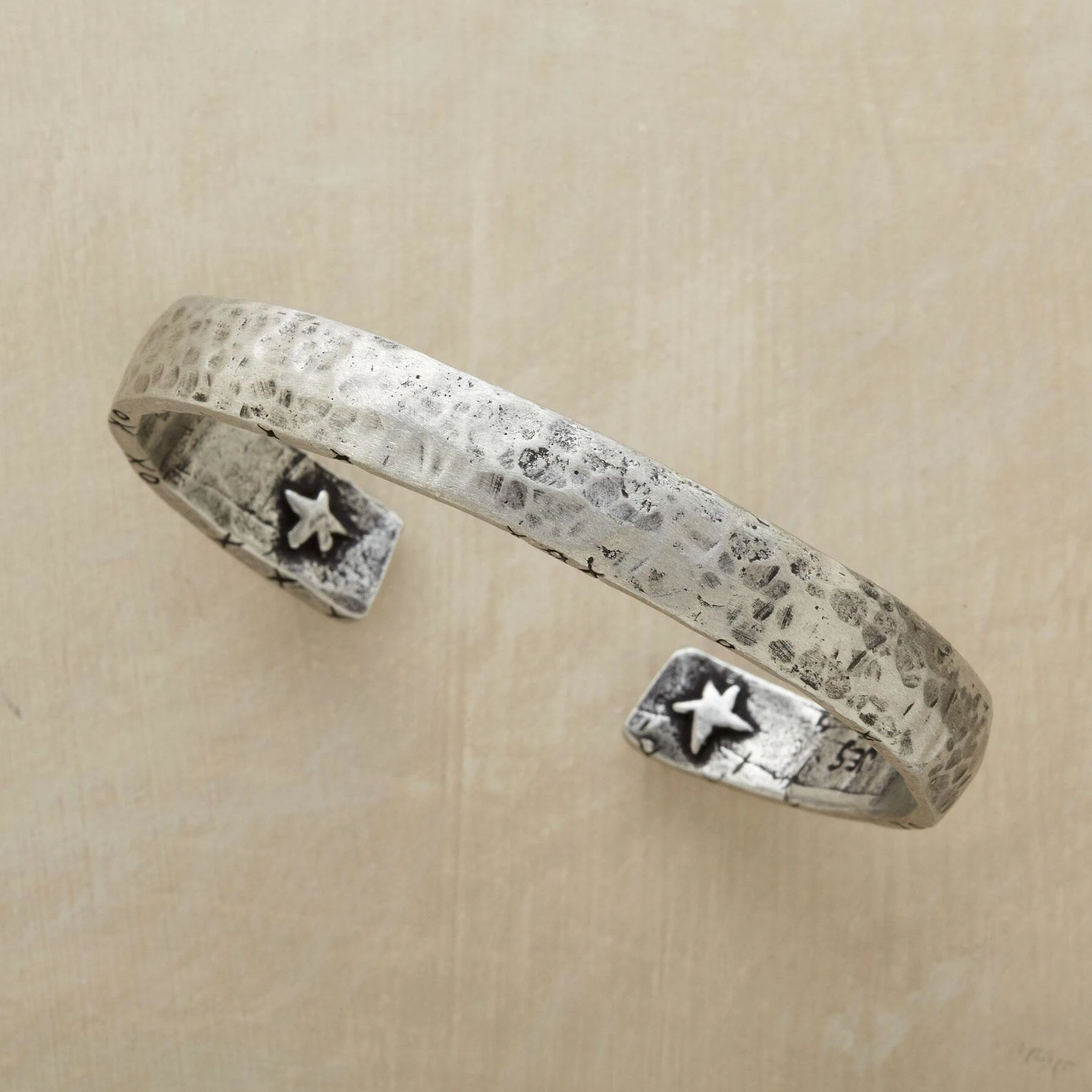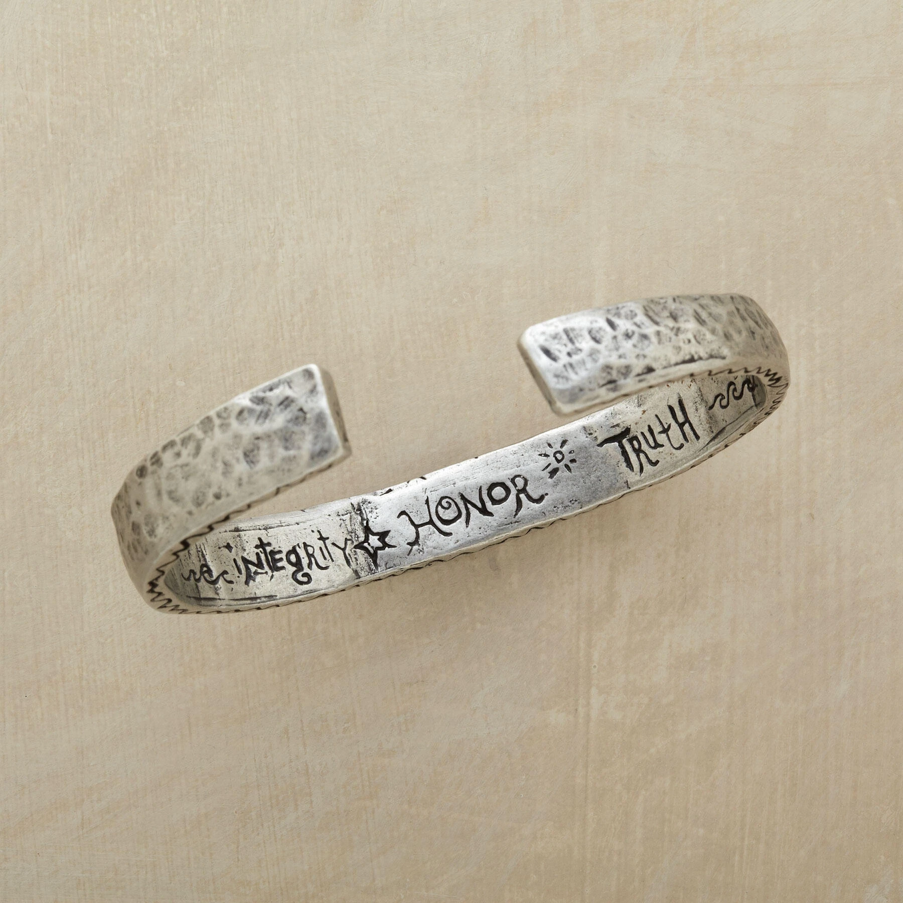 Words to live by, “Integrity-Honor-Truth,” are inscribed inside Jes MaHarry’s men’s organic hammered pewter cuff bracelet. Handcrafted in USA. Exclusive. 3″ dia.