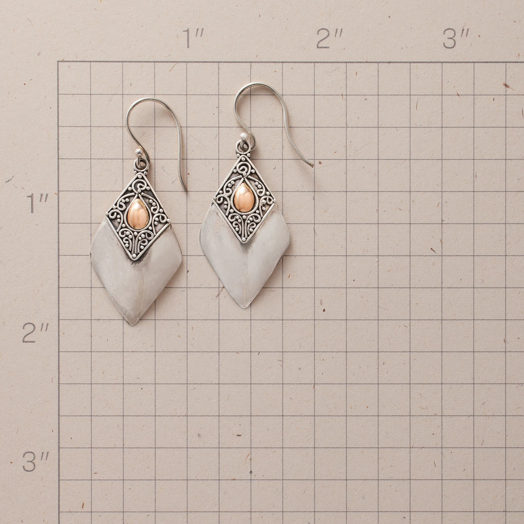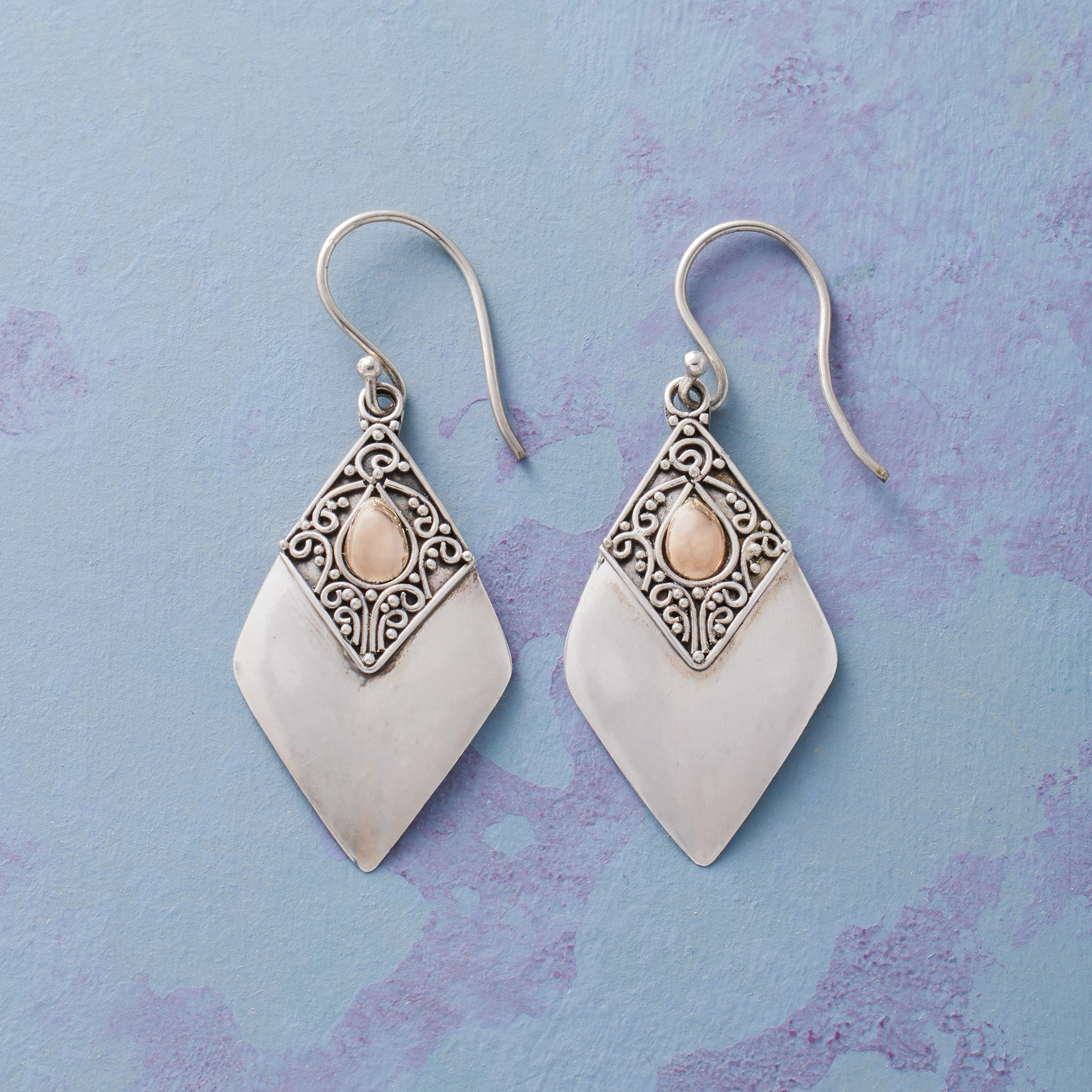 Intricate filigree tops softly domed diamonds of sterling silver, holding drops of 18kt gold plate in a lacy net. Suspended from sterling French wires. Handcrafted. Exclusive. 1-3/4″l.