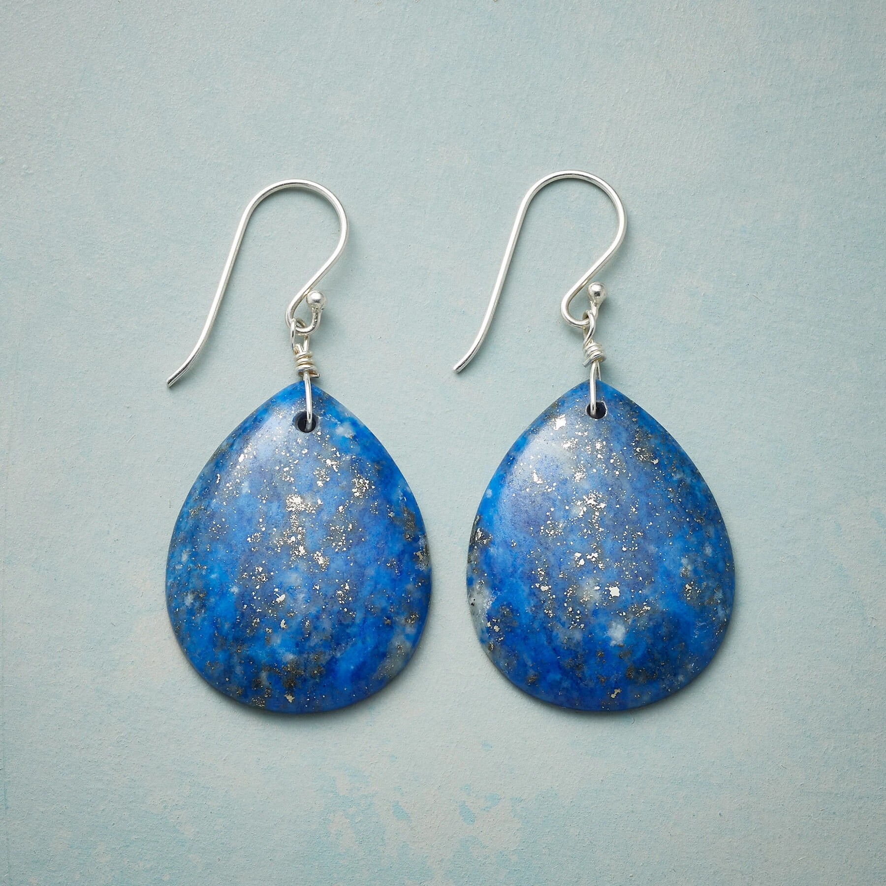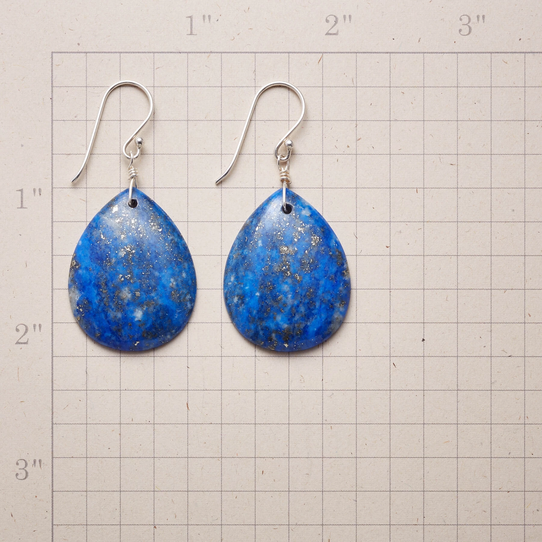 Large hand-cut lapis lazuli teardrops show off the depth and fascinating variation of this incredible stone. Sterling silver French wires. Handmade. Exclusive. 2″L.
