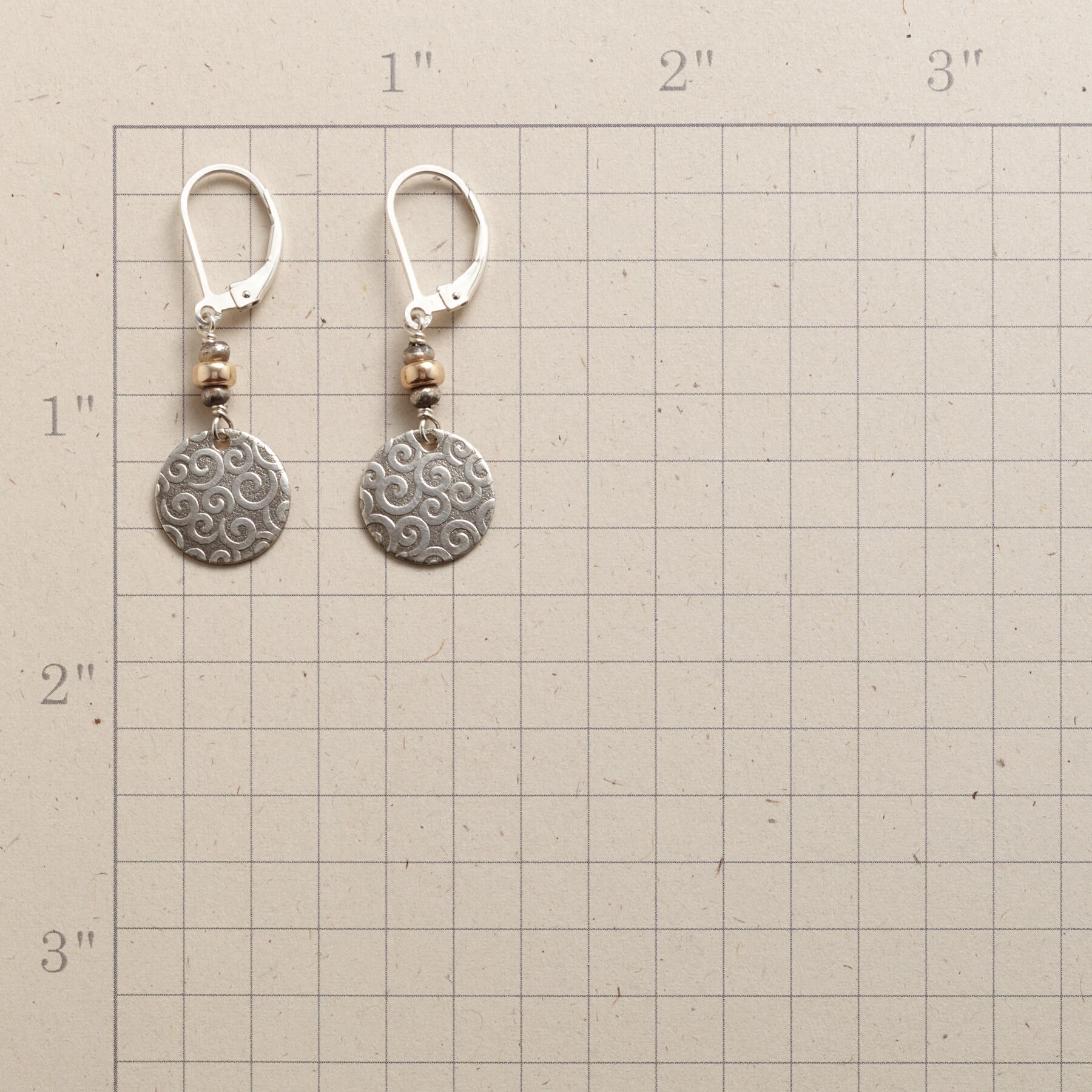Swirls emerge from oxidized, sterling silver disks that dangle beneath a shining 14kt gold-filled bead. Leverback wires. Earrings handcrafted in USA exclusively for Sundance. 1-1/4″L.