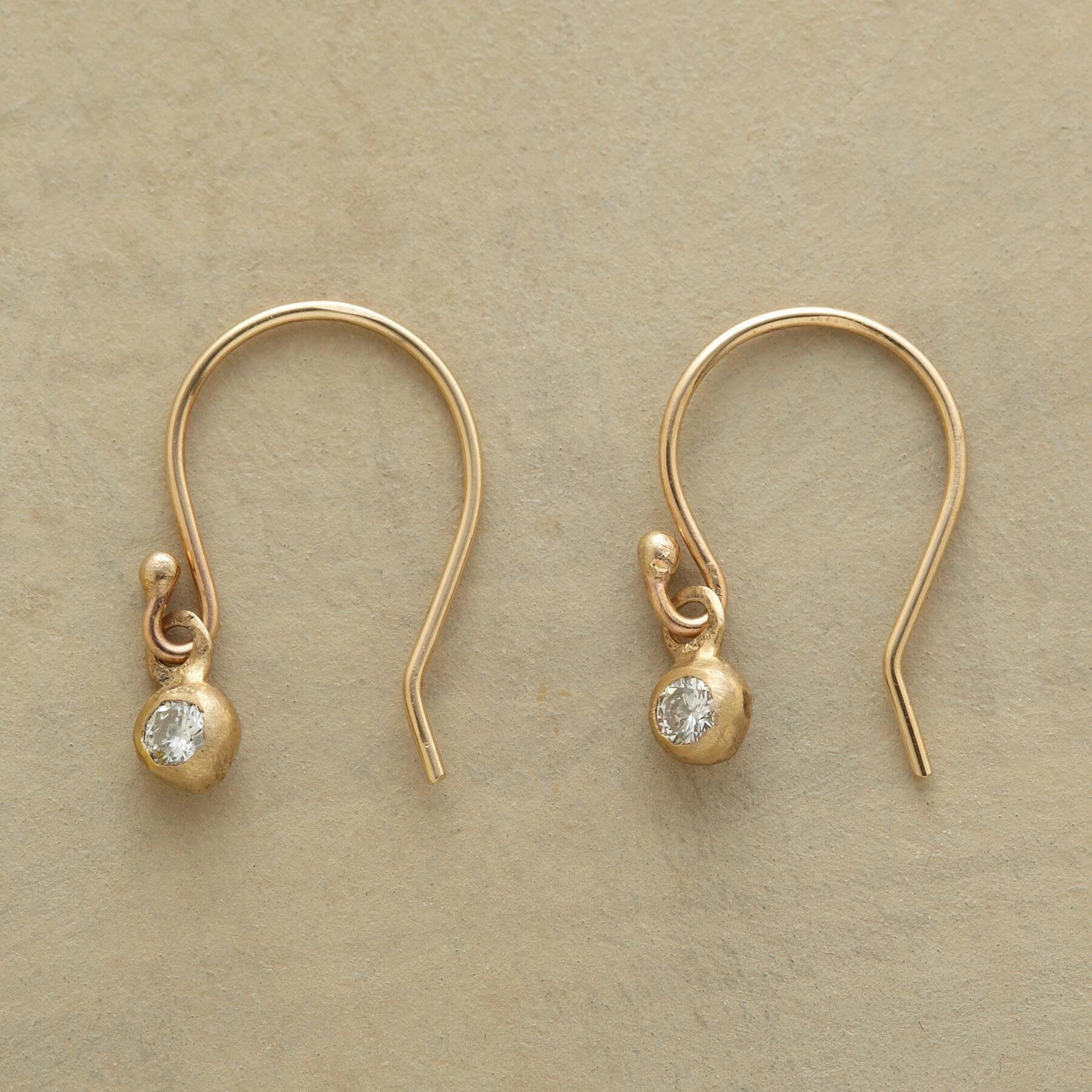 Dazzling beyond their size, these dainty diamond drop earrings in matte 14kt gold pack a pretty little punch. French wires. Handmade in USA by Kyoko Honda. 5/8″l.