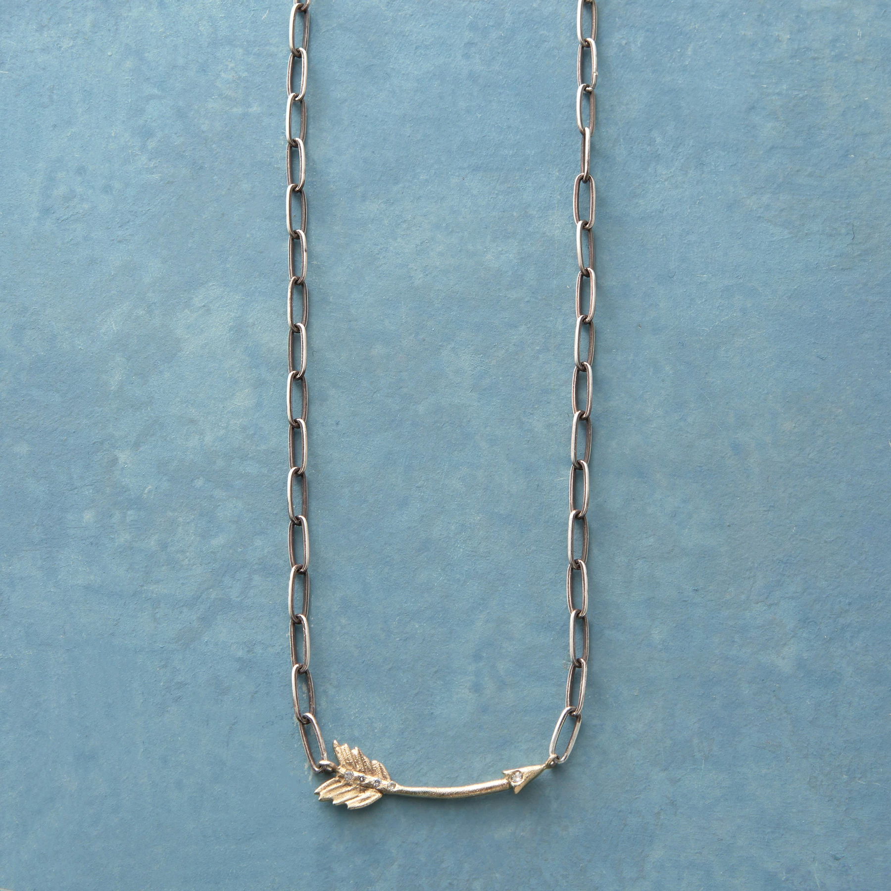 Power, grace, beauty – all are celebrated in this Handmade necklace by Nichole McIver. The chain is oxidized sterling silver. The arrow pendant is 14kt gold and set with sparkling diamonds. Lobster clasp. Made in USA. 16″L.