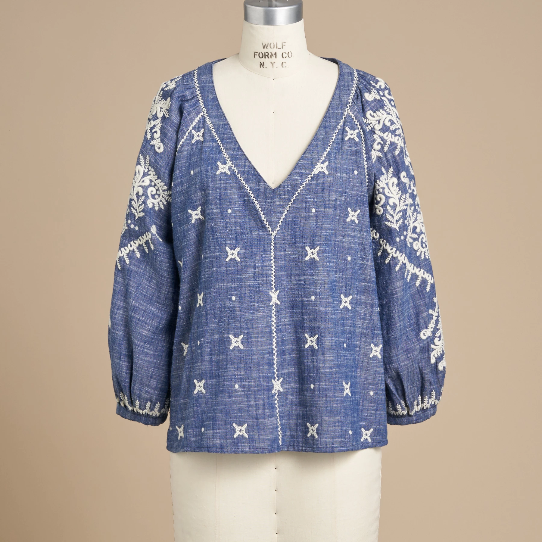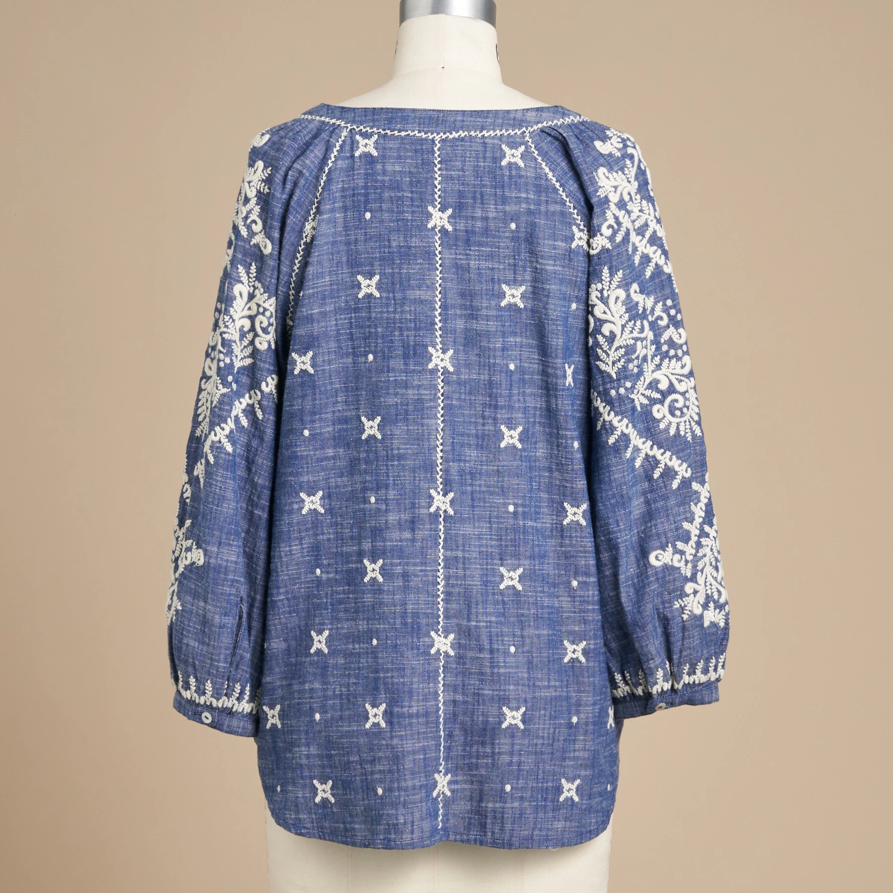 There’s joyful bohemian flair in this yarn-dyed top with luscious allover embroidery, blanket stitch details, three-quarter sleeves, shell buttons and V-neck. Full, easy fit. Cotton. Machine wash. Imported. Exclusive. Sizes XS (0 to 2), S (4 to 6), M (8 to 10), L (12 to 14), XL (16 to 18), XXL (20 to 22). Approx. 24-1/2″L.