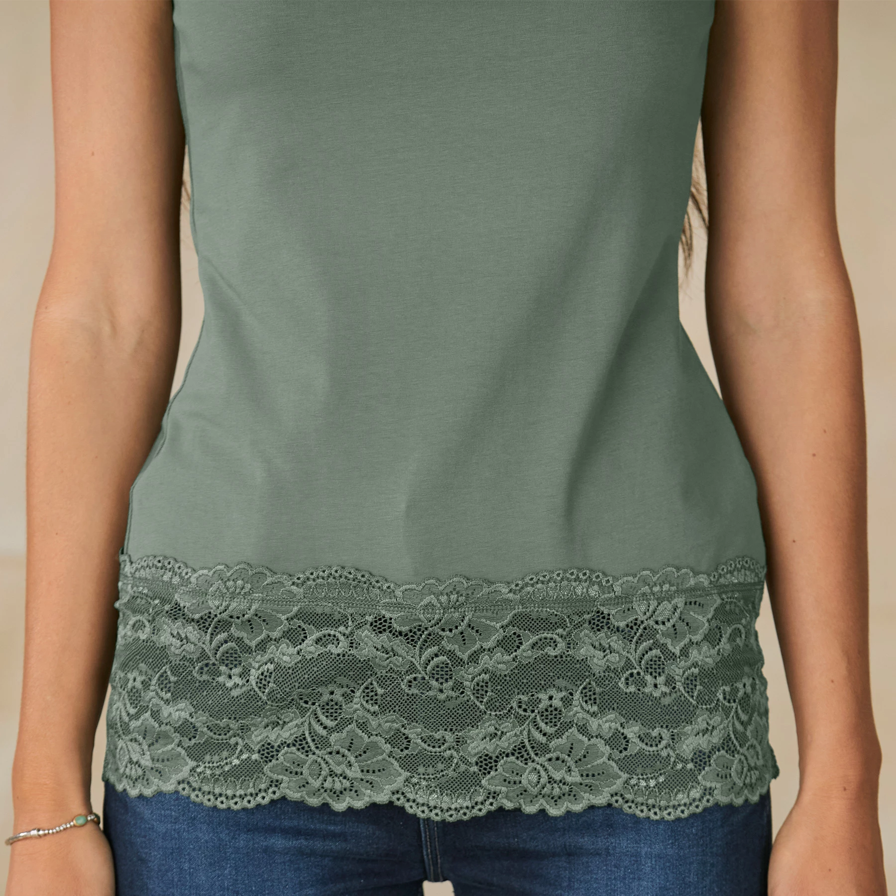 Our essential, lace-trimmed tank is slim-fitting for plenty of versatility. Pair with a sweater or tee for a glimpse of flirty lace. Cotton/spandex. Machine wash. Portugal. Exclusive. Sizes XXS (00), XS (0–2), S (4–6), M (8–10), L (12–14), XL (16–18). Approx. 23-1/2″l.