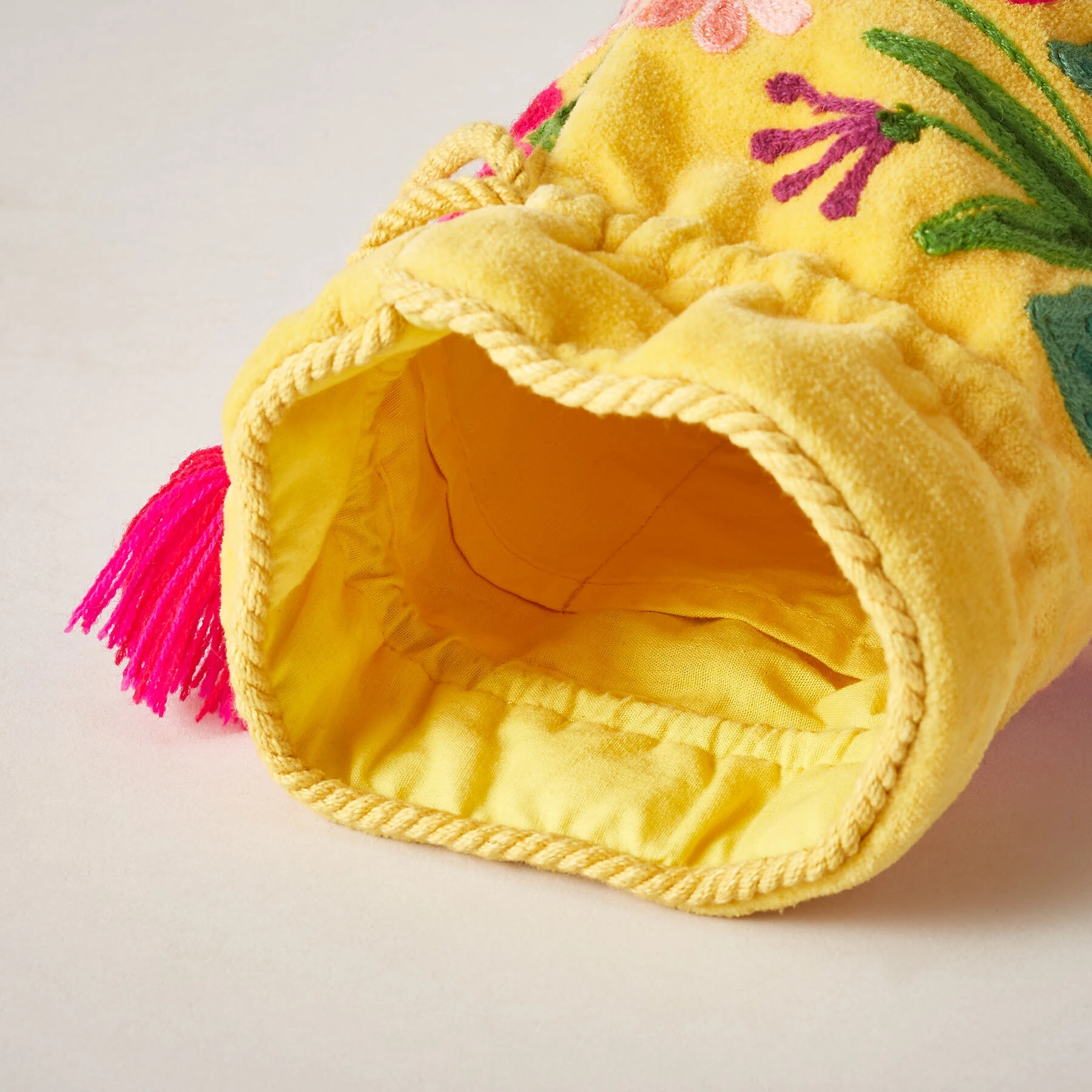 A fitting home for favorite treasures, or a gift bag that’s a gift in itself, our drawstring pouch is sewn of soft cotton velvet embroidered with bright blooms and finished with a tasseled cord. Imported. 4-1/2″ dia. x 6″H.