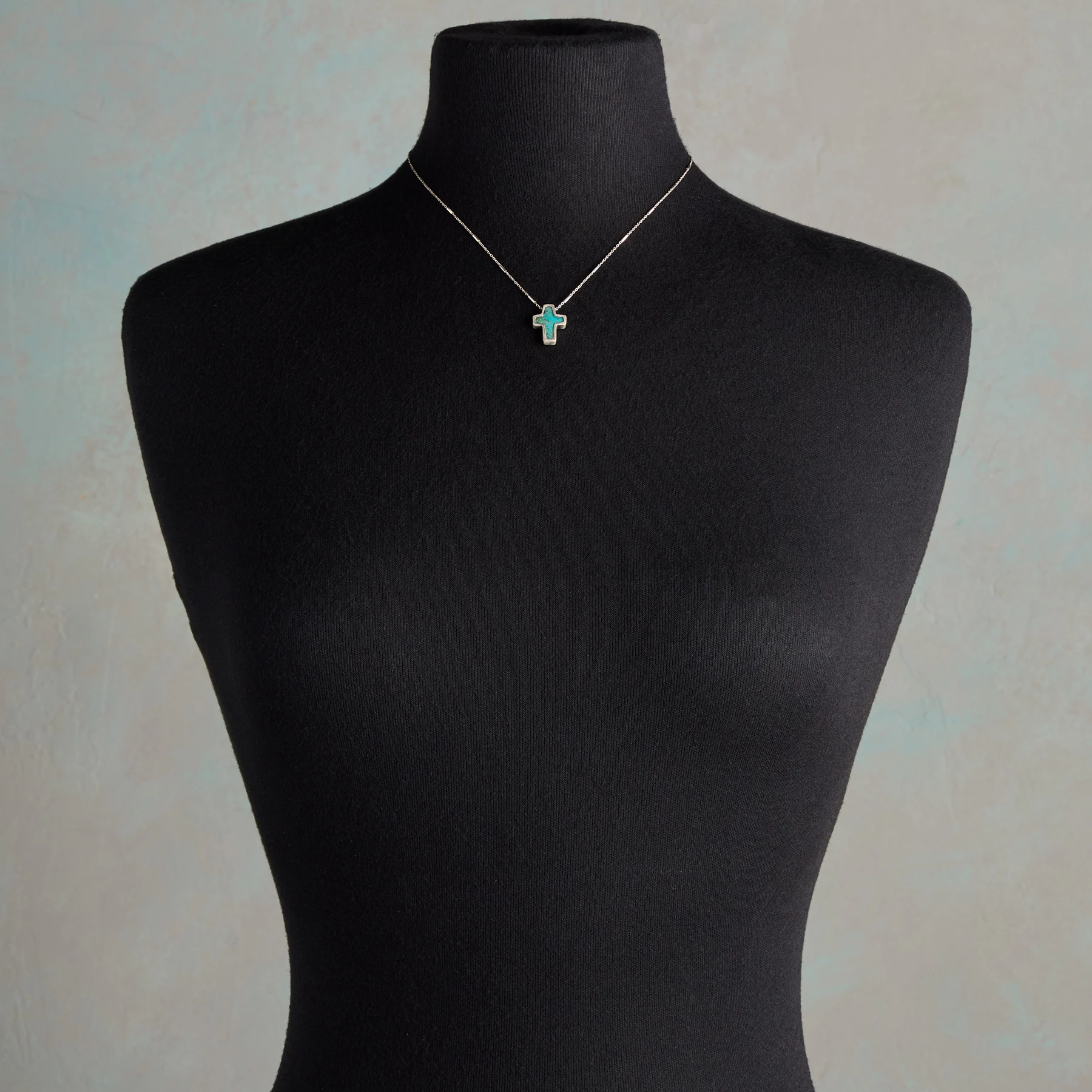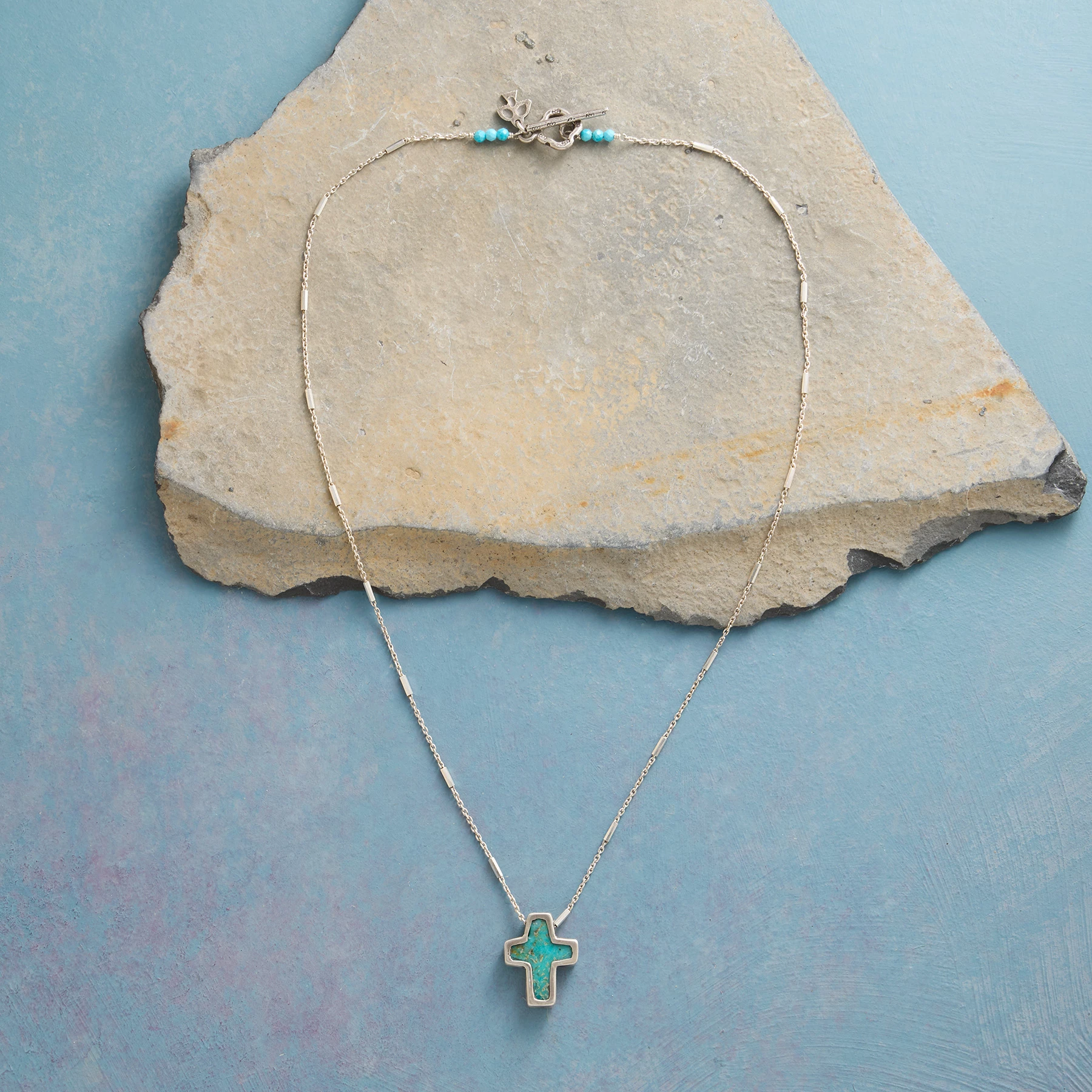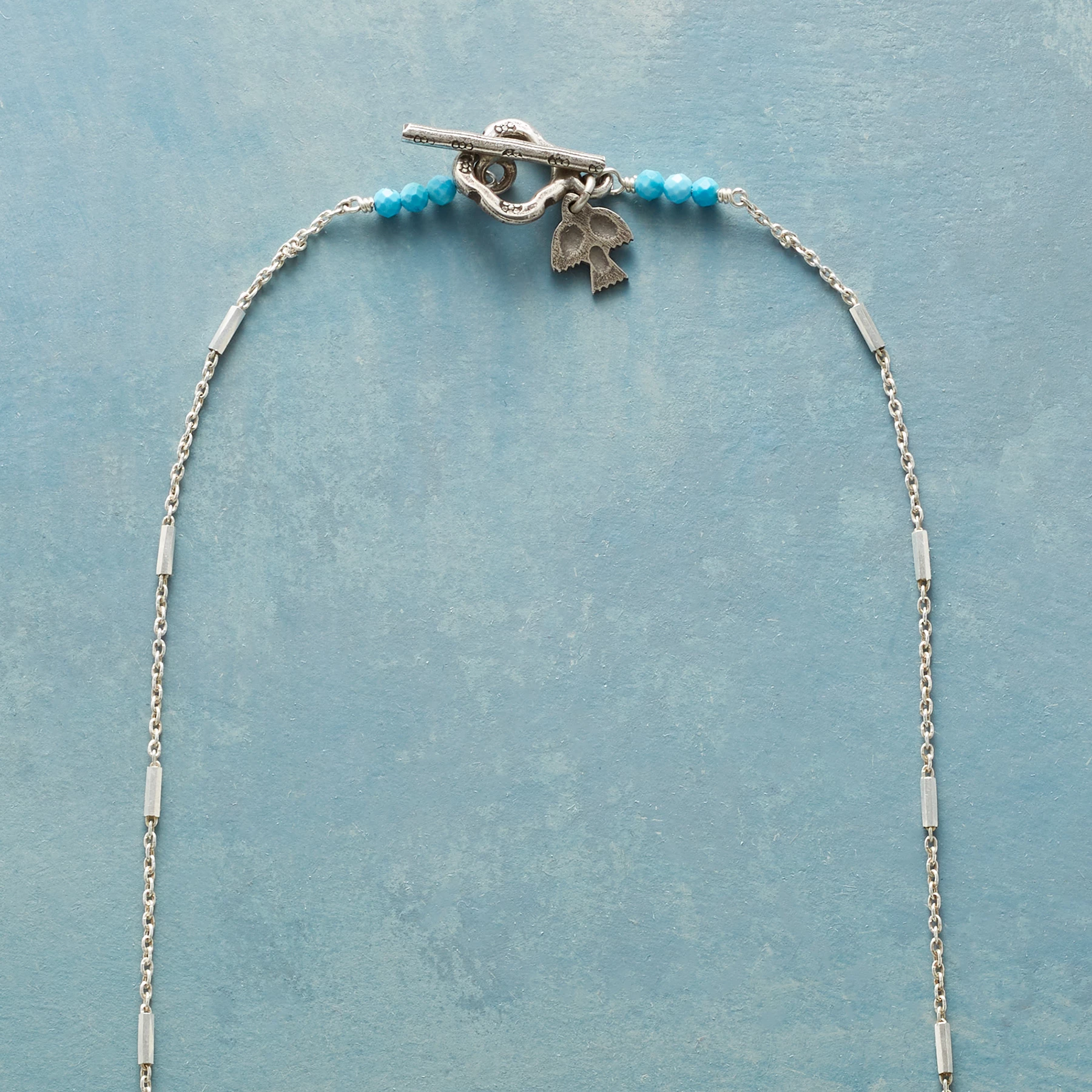 Turquoise wrapped in sterling silver proclaims its faith on a segmented chain of matching metal. Exclusive. Handmade with turquoise rondelles at toggle clasp. 17″L, 3/4″ drop.