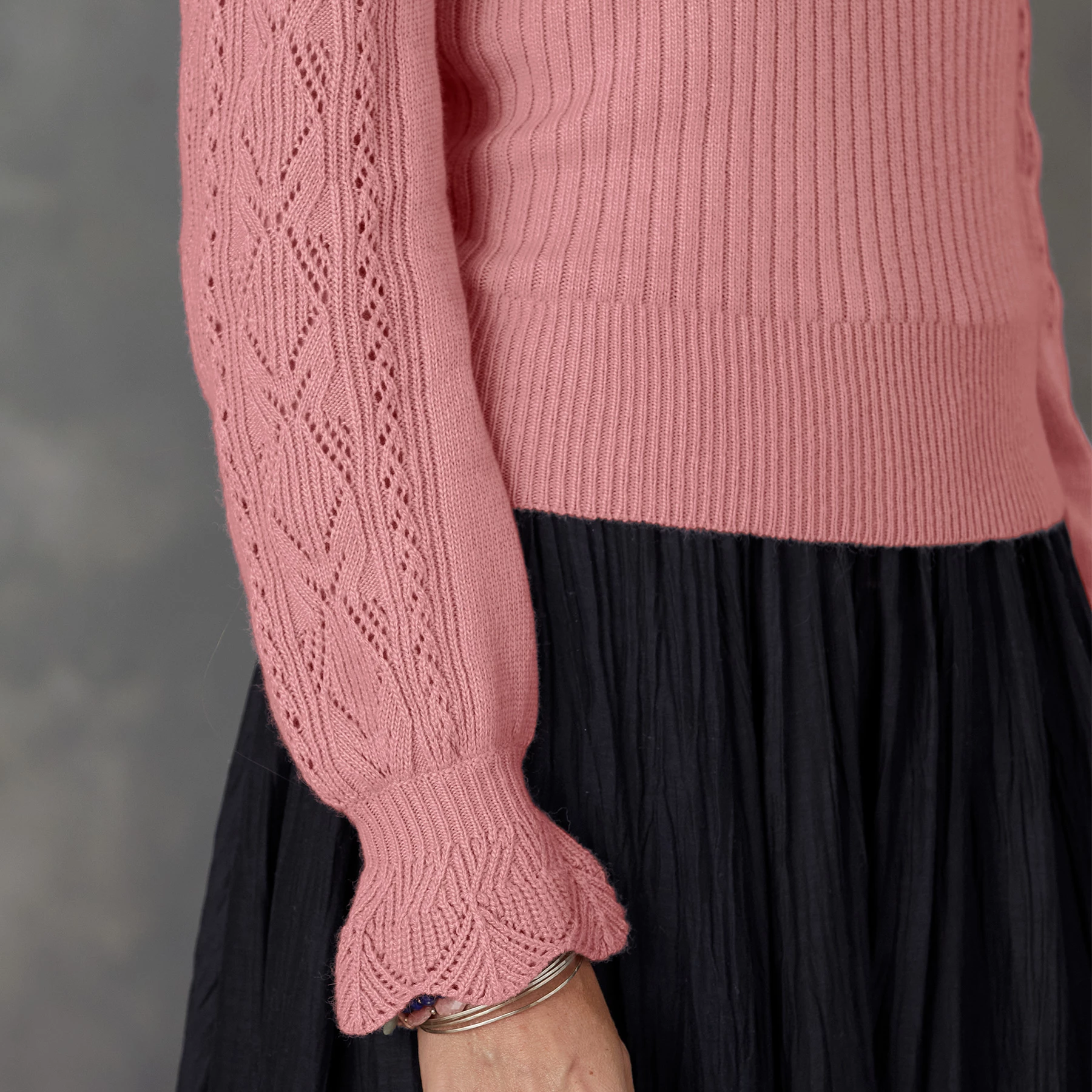 Pointelle puff sleeves with ruffled cuffs lend an elegant, airy feel to this ribbed scoop neck sweater. Viscose/nylon/wool. Hand wash. Imported. Sizes XXS (00), XS (0–2), S (4–6), M (8–10), L (12–14), XL (16–18). Approx. 20″l.