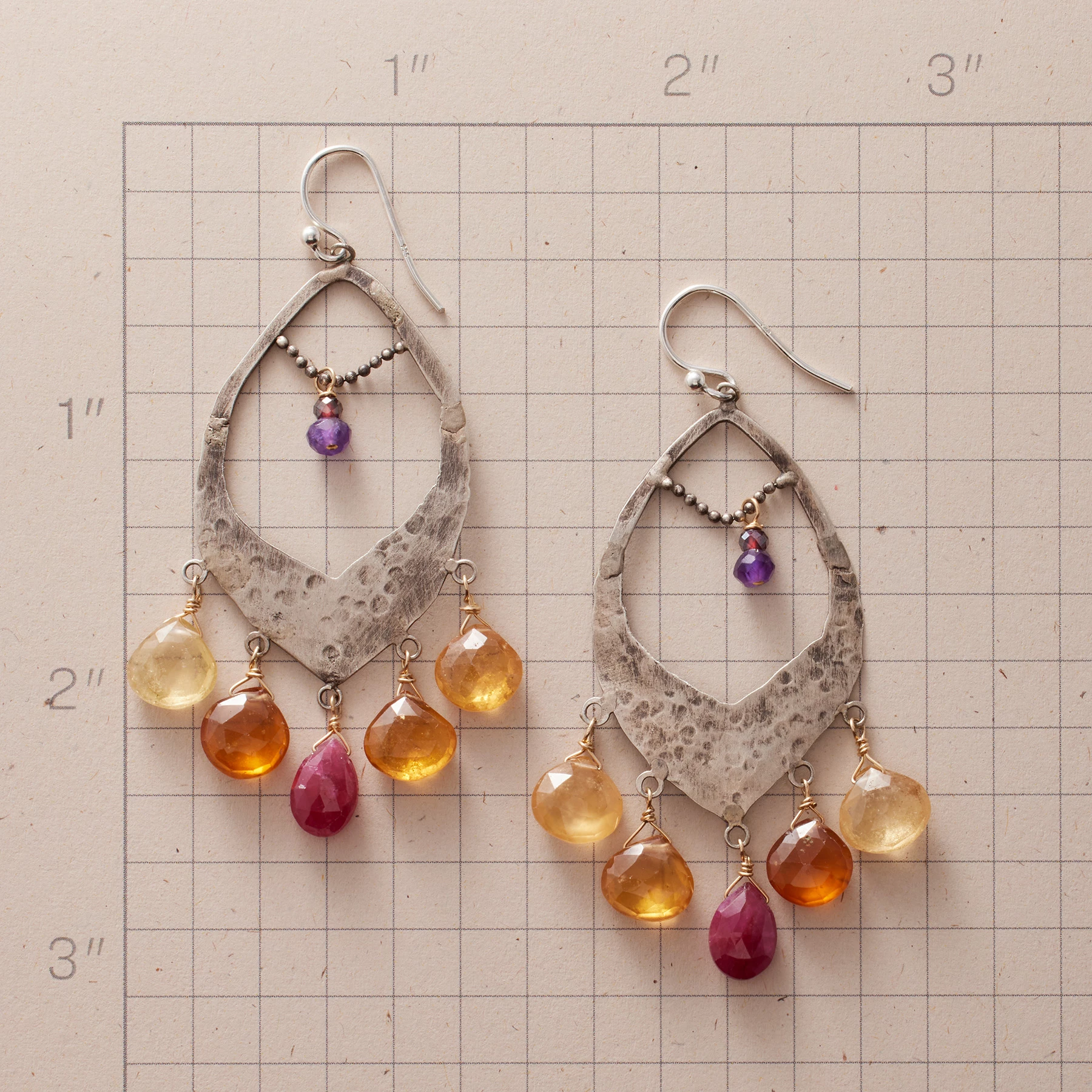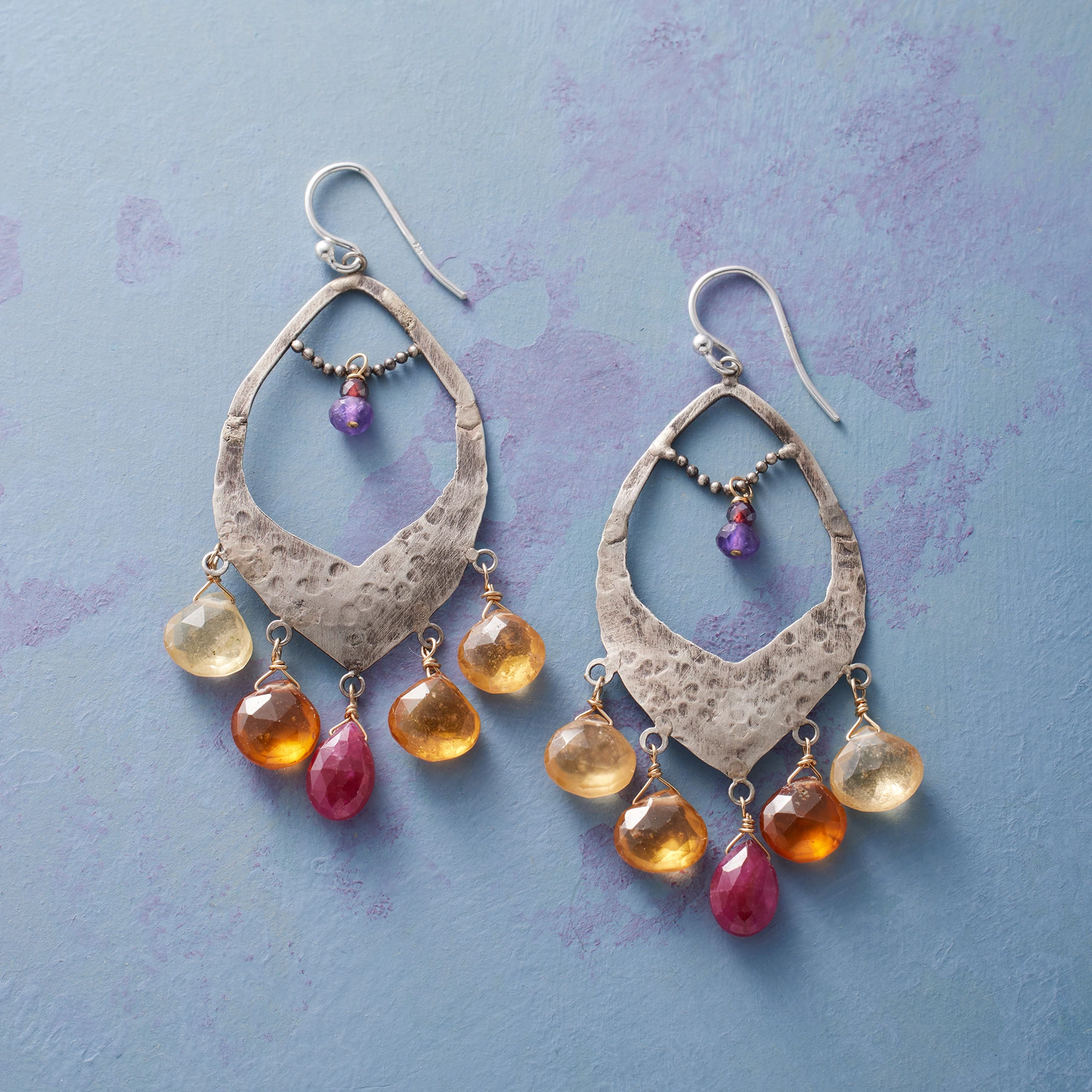 Hammered flames of sterling silver blaze with fiery gems from citrine to hessonite garnet to ruby. At the center, red garnet and amethyst flicker from beaded chains. Sterling French wires. Handcrafted in USA. Exclusive. 2-5/8″l.