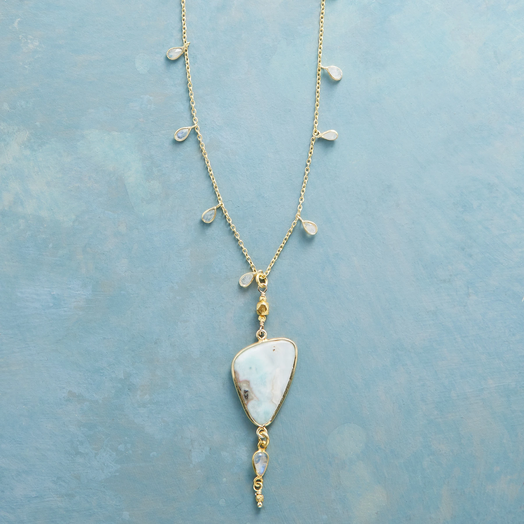 As delicate as the dawn, our necklace pairs a shower of moonstone droplets and an ethereal larimar pendant with the sun-touched glow of 18kt gold vermeil. Lobster clasp. Handmade in USA. 19″L, 2-1/2″ drop.