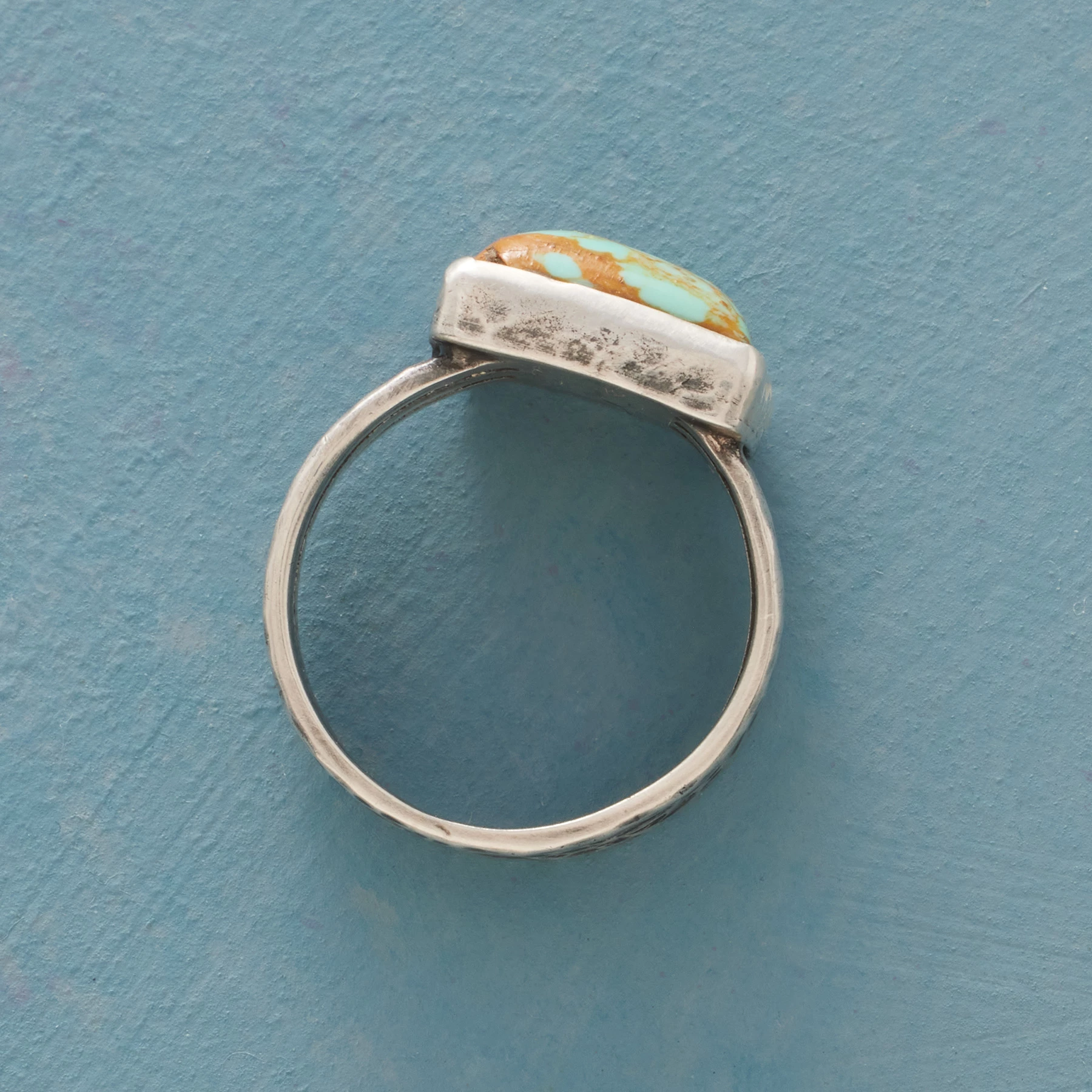 Hand cast and hammered, our split-shank sterling silver ring bears a lightly oxidized finish and a square of natural turquoise, each stone one-of-a-kind. Exclusive. Whole sizes 5 to 9. 5/18″ tapers to 1/4″.