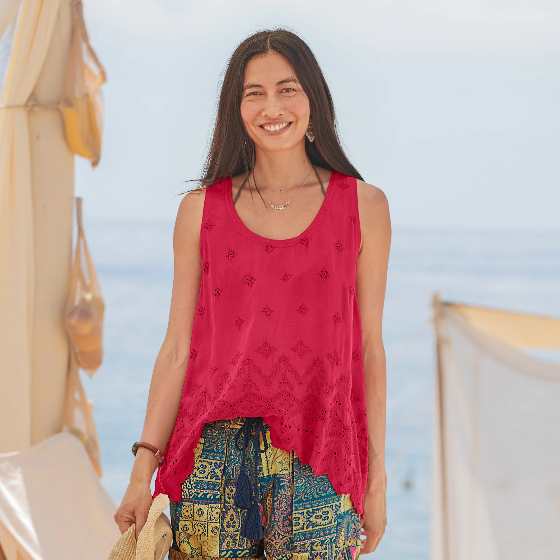 Feel flawless in this sweet, eyelet tank that flatters with a subtle A-line hem, scalloped details, and tonal embroidery. Unlined. Viscose. Hand wash. Imported. Sizes XS (0 to 2), S (4 to 6), M (8 to 10), L (12 to 14), XL (16 to 18), XXL (20 to 22). Approx. 24-3/4″L.