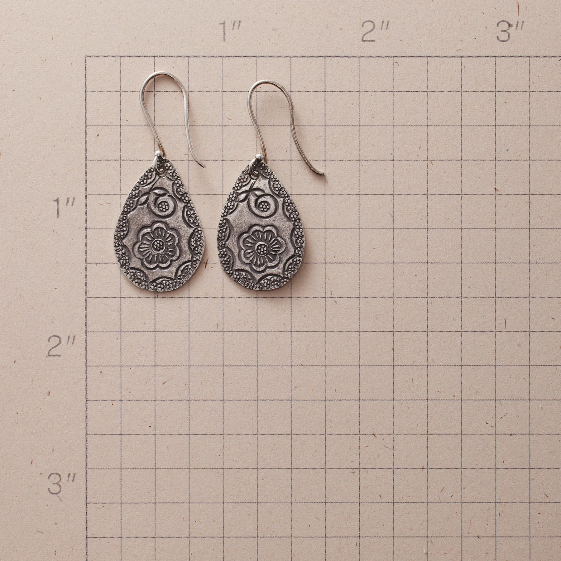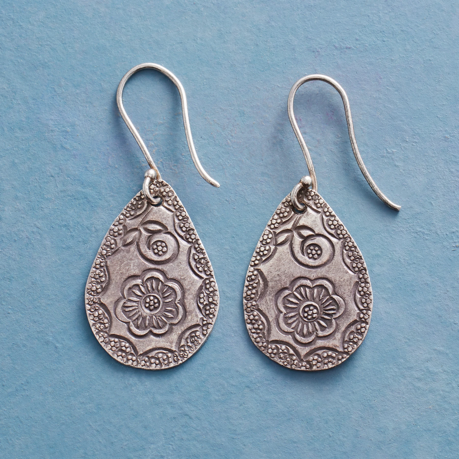 Thai silver teardrops, sweetly stamped with flowers and scallops, are lovely, lightweight and infinitely wearable — proof that everyday earrings don’t have to be plain. Sterling silver French wires. Handcrafted. 1-1/2″l.