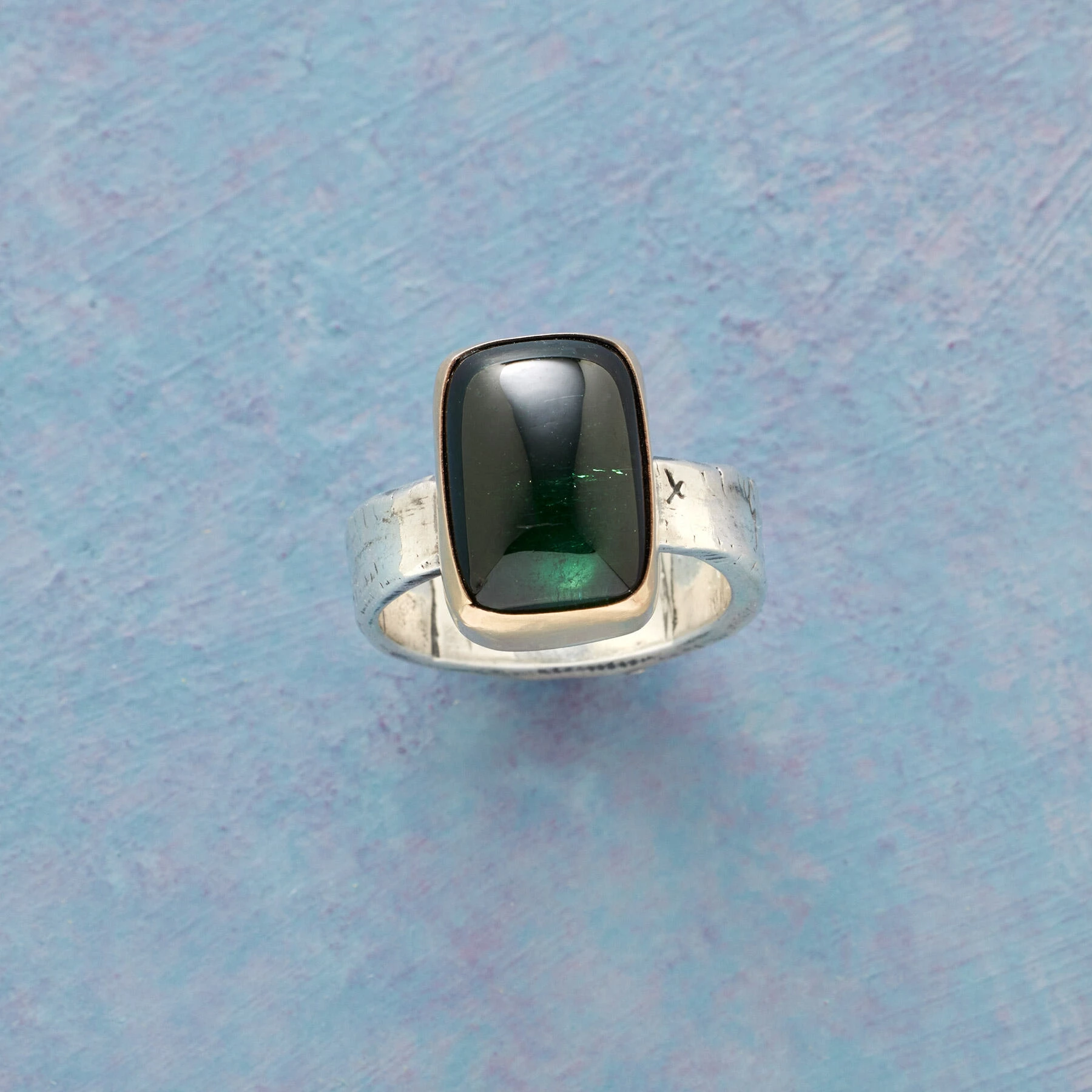 Like the forest gilded by sunlight, a green tourmaline wrapped in 14kt gold enchants atop Jes MaHarry’s etched sterling silver ring. A star winks from the band. Handmade in USA. Exclusive. Whole sizes 5 to 9.