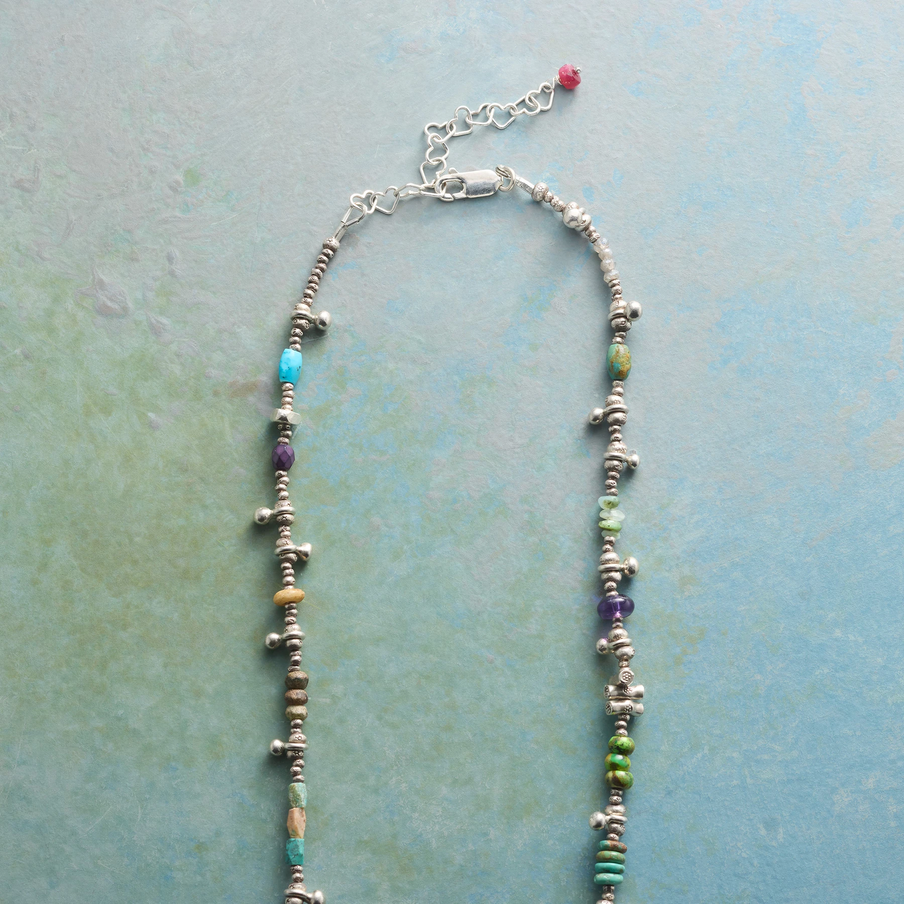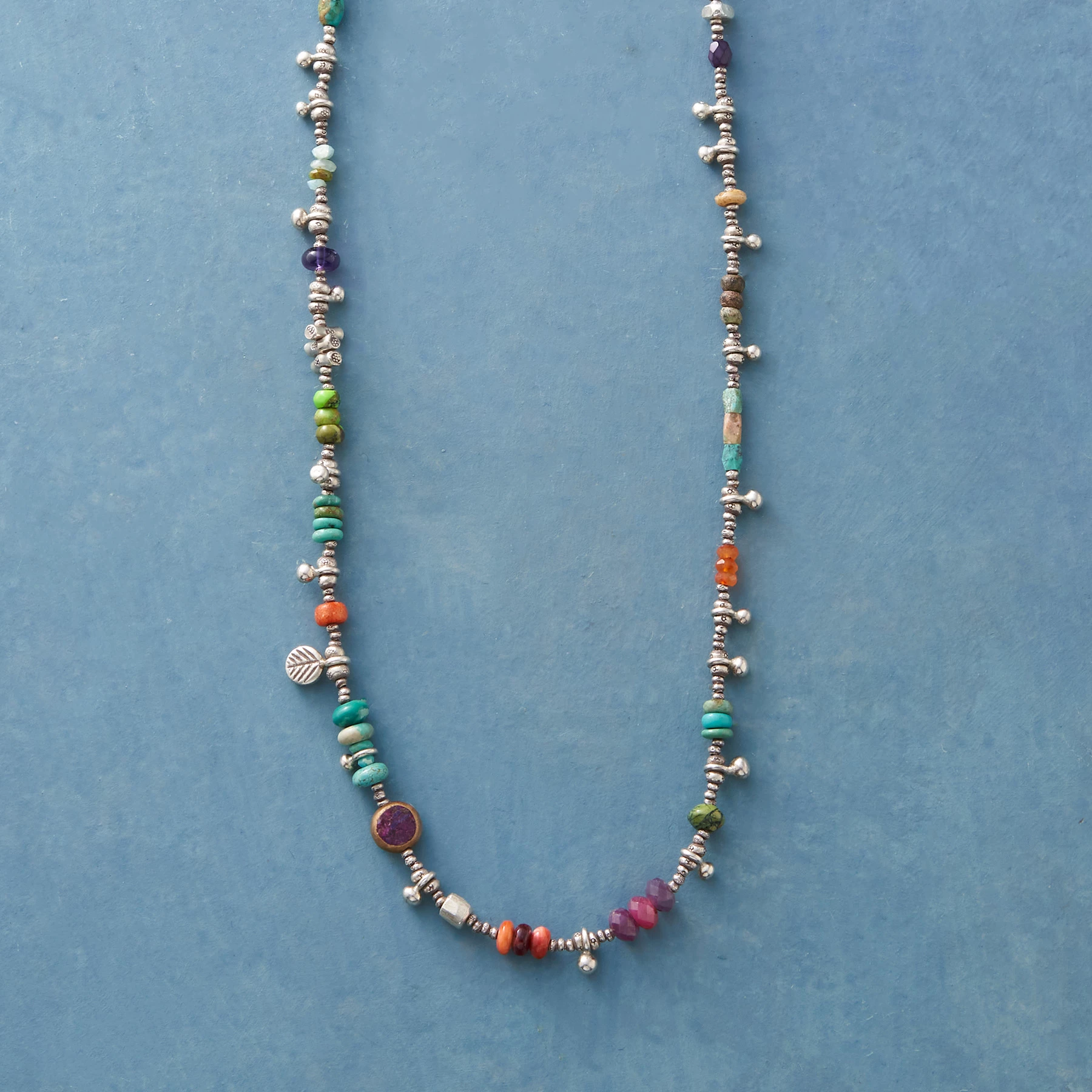 Thai silver beads play in a freeform necklace strung with a mix of stones including amethyst, opal, labradorite, ruby, carnelian, coral and turquoise, one stone resting within a copper bezel. Sterling silver lobster clasp. Made in USA. Exclusive. 17″ to 18-1/2″L.