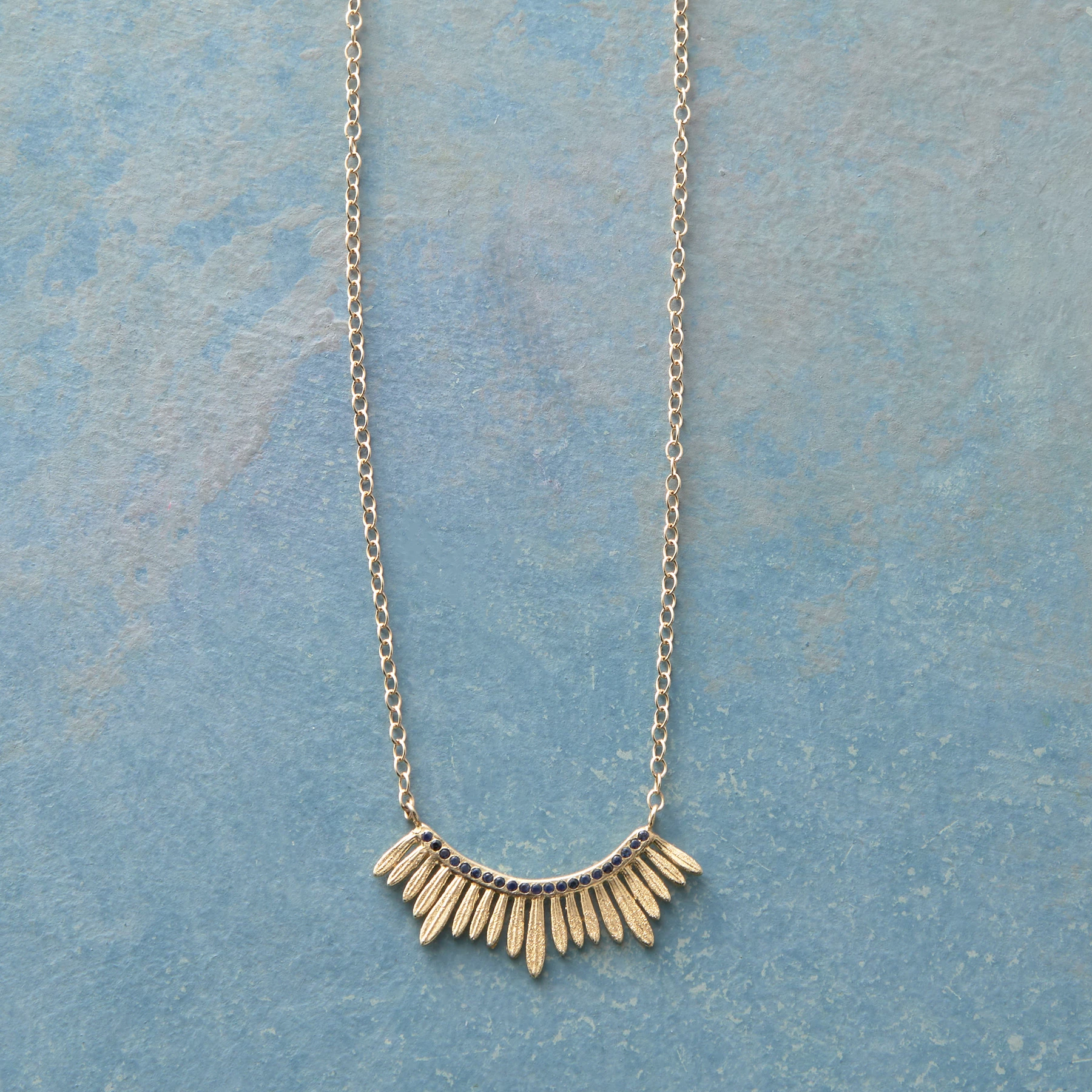 A necklace of rare and bold beauty handmade with a 14kt gold chain on which a collar pendant is fringed with 24kt gold feathers and topped with blue sapphires. 14kt gold lobster clasp. Made in the USA by Nichole McIver. 16″L.