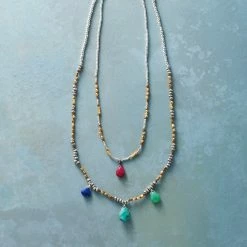Thai silver and 14kt gold-plated beads mingle with bronze glass seed beads to set a lively, lovely stage for sparkling drops of lapis, and enhanced red onyx, ruby, chalcedony and compressed turquoise. Our two-strand necklace closes with a sterling silver lobster clasp and extender chain. Handcrafted in USA. Exclusive. 15″ to 18″l.