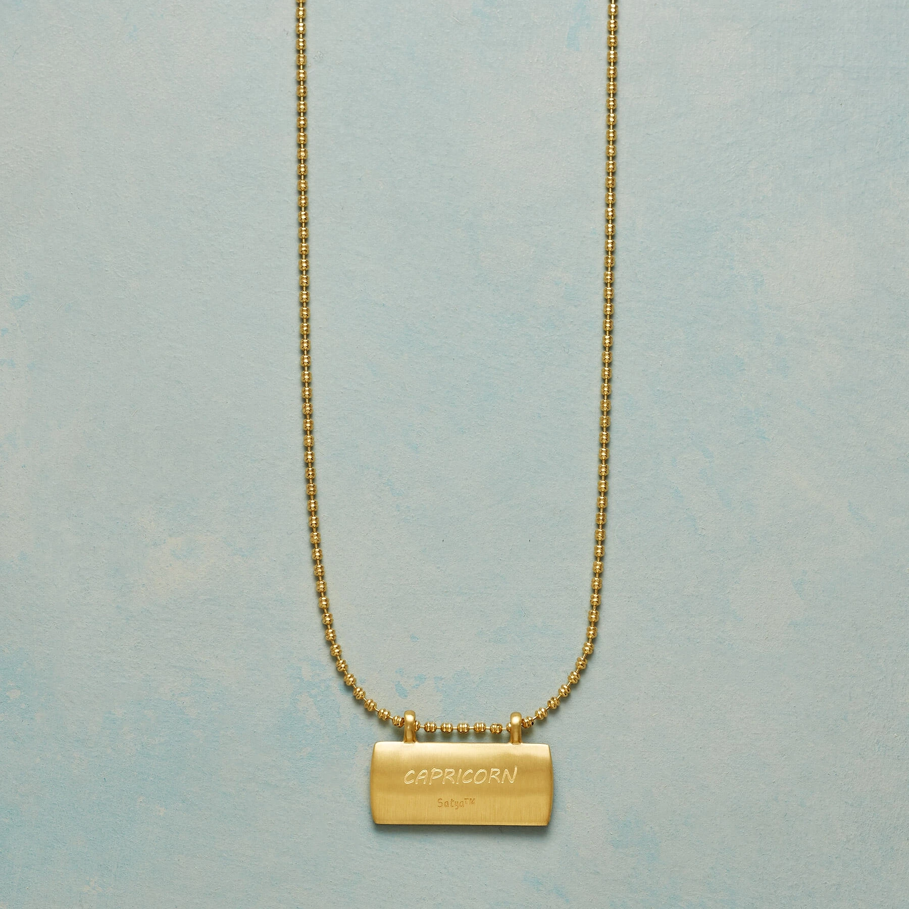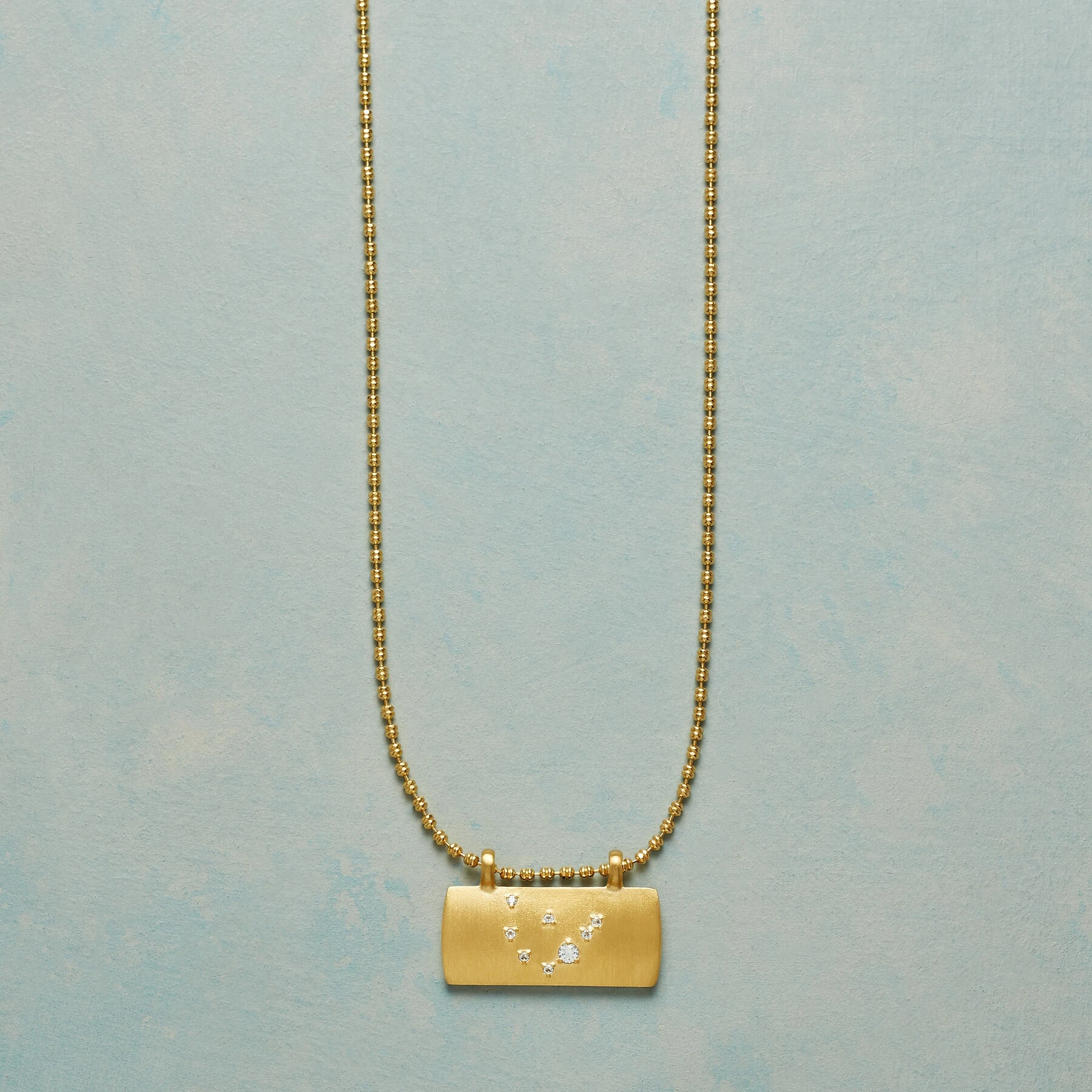 Our sleek 18kt gold-plated pendant necklace hosts a straightforward expression of your astrological birth sign in sparking white topaz. 18kt gold-plated ball chain and spring ring clasp. Exclusive. 18″L.