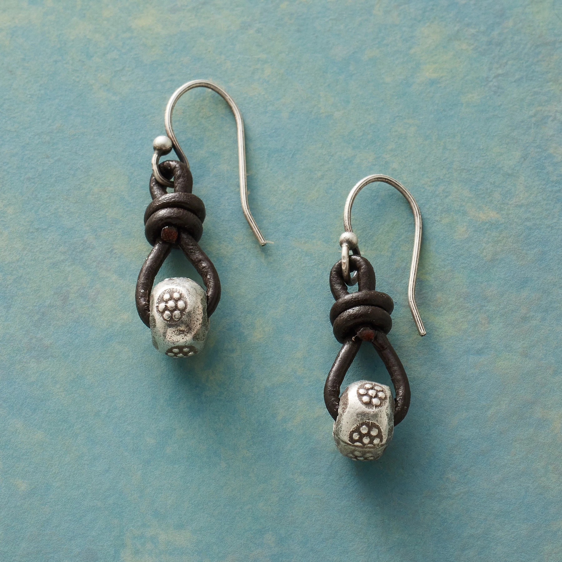 Meet your new everyday earrings. Hand-stamped Thai silver beads tethered with dark brown leather knots go with everything from jeans and a tee to a sundress and sandals. Sterling silver French wires. Handcrafted. Exclusive. 1-1/8″L.