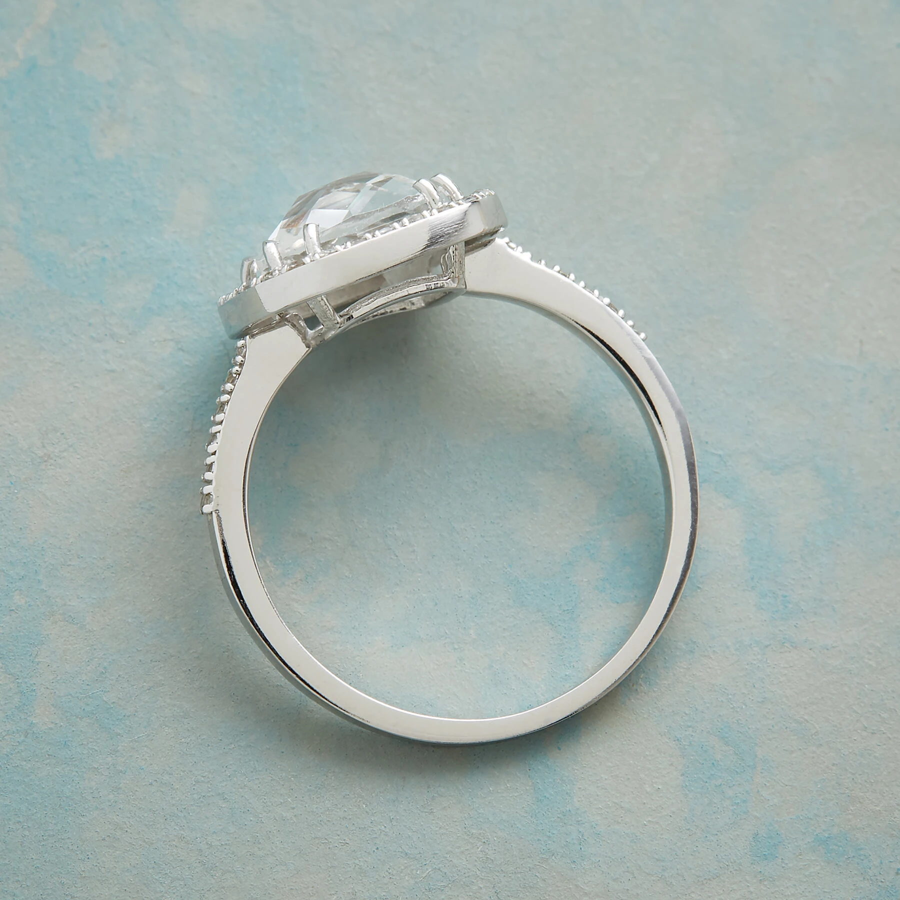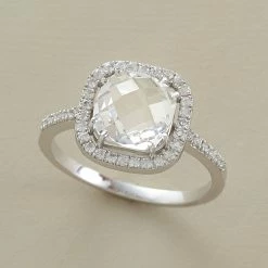 Harlequin facets are like diamond shaped windows into crystal clear white topaz. Suzanne Kalan frames the stone with sparkling white sapphires. Handcrafted in 14kt white gold. Whole sizes 5 to 8.