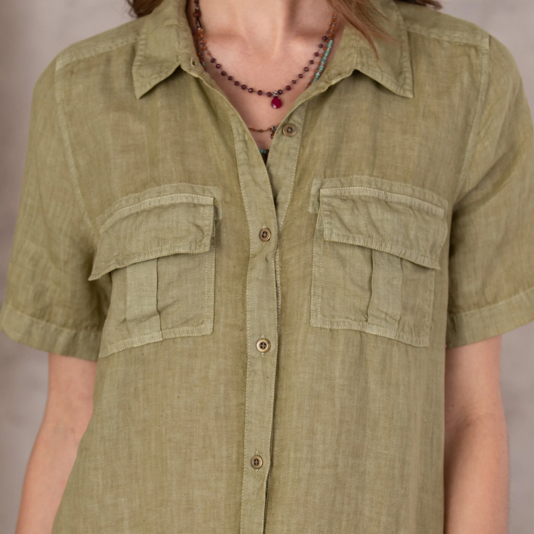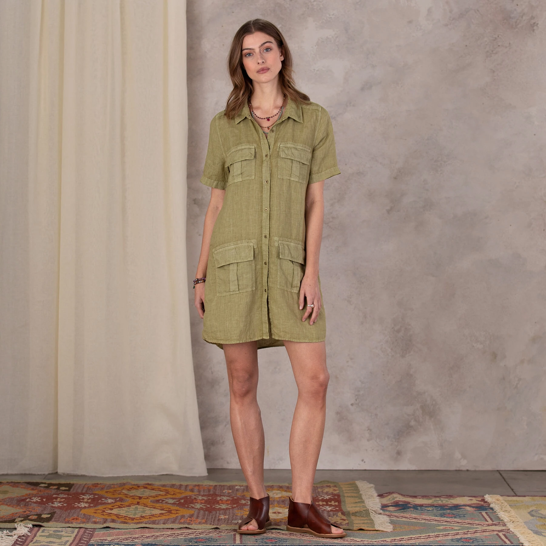 Garment-dyed linen shirt dress with metal button front, four pockets. Hand wash. Imported. Exclusive. Sizes XS (0 to 2), S (4 to 6), M (8 to 10), L (12 to 14), XL (16 to 18), XXL (20 to 22). Approx. 35-1/2″L.