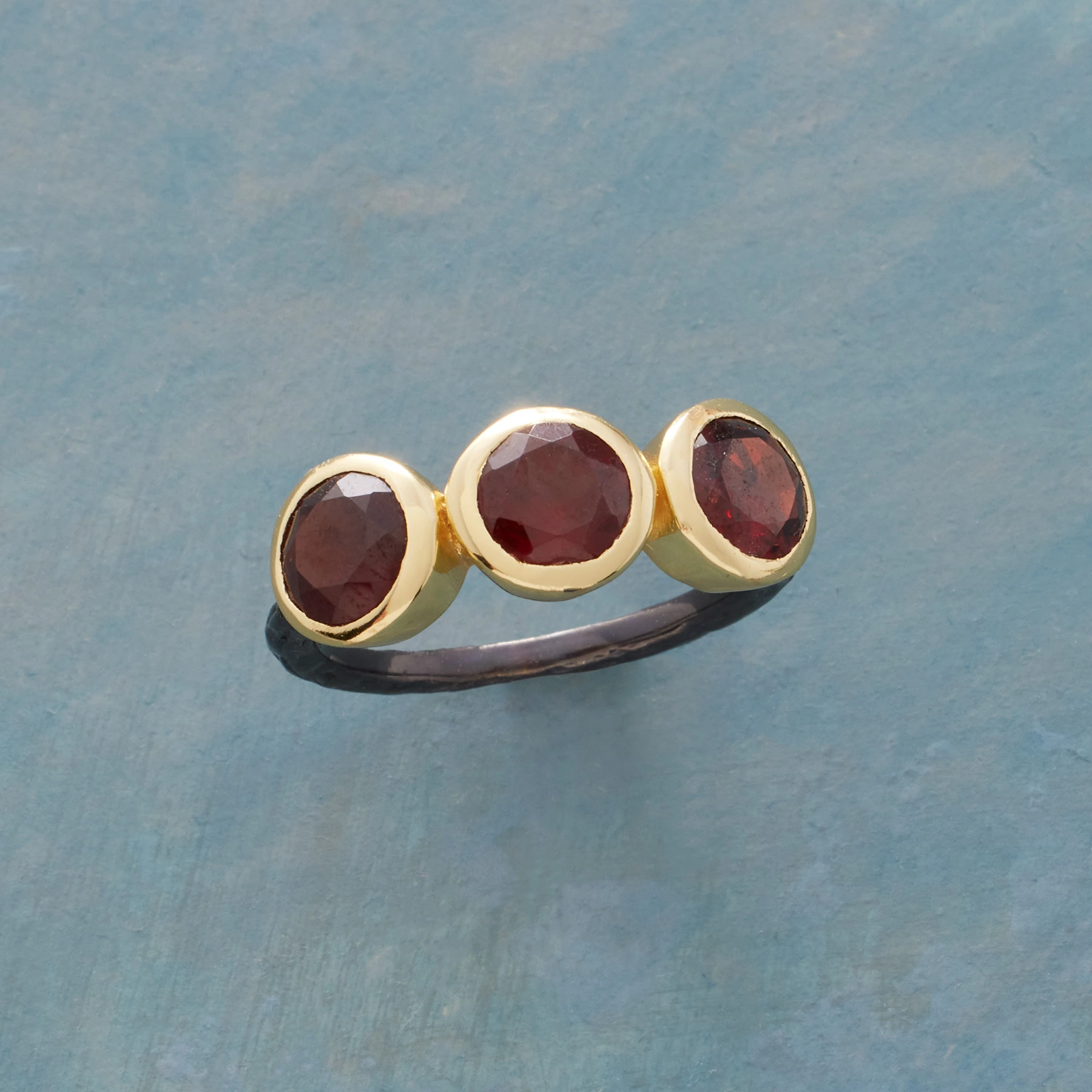 A garnet trio set in 14kt gold vermeil blazes atop a distinctive black ruthenium-plated band. Handmade. Exclusive. Whole sizes 5 to 9.