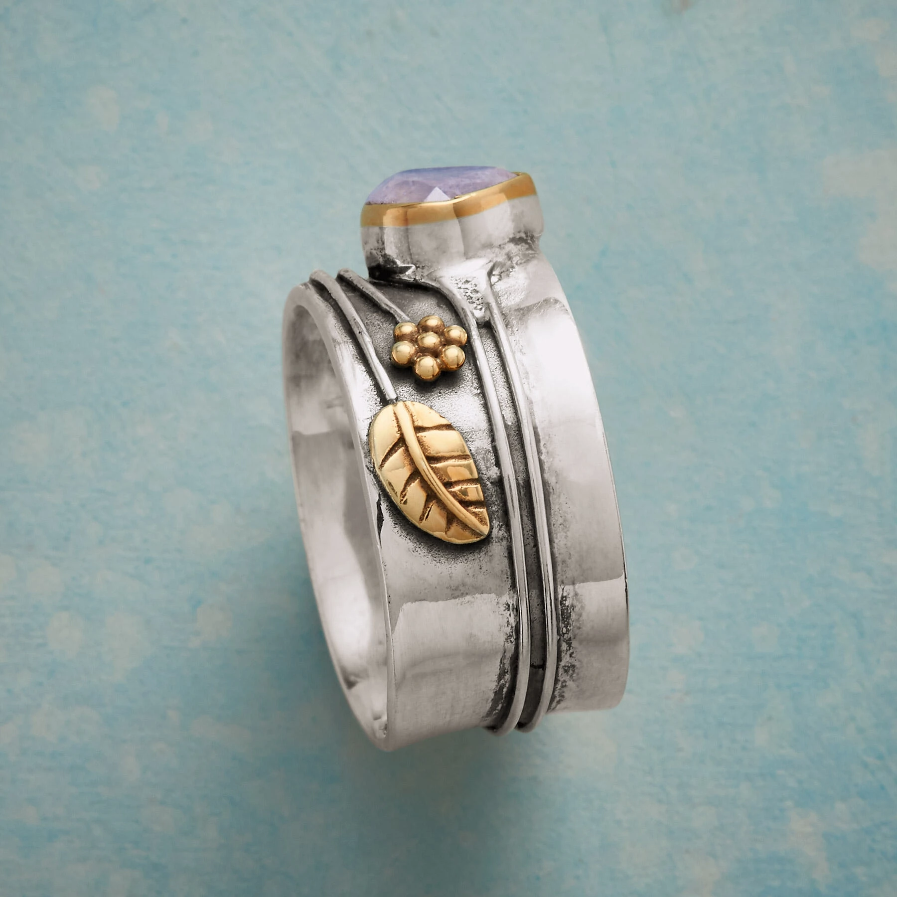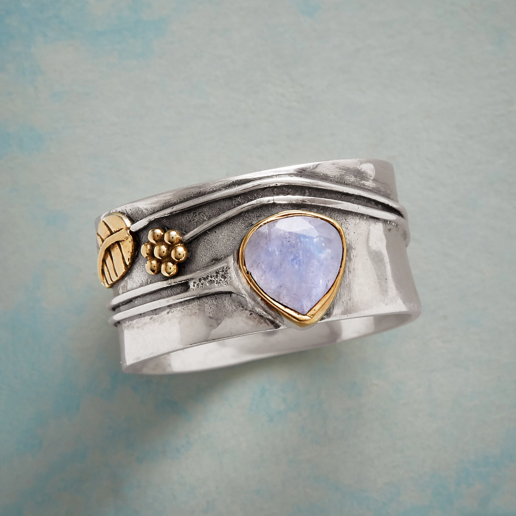 A polished and oxidized sterling silver band, detailed with vines, plays host to a single, teardrop-shaped moonstone in a contrasting 14kt gold-plated bezel. Exclusive. Whole sizes 5 to 10. Approx. 1/2″W.