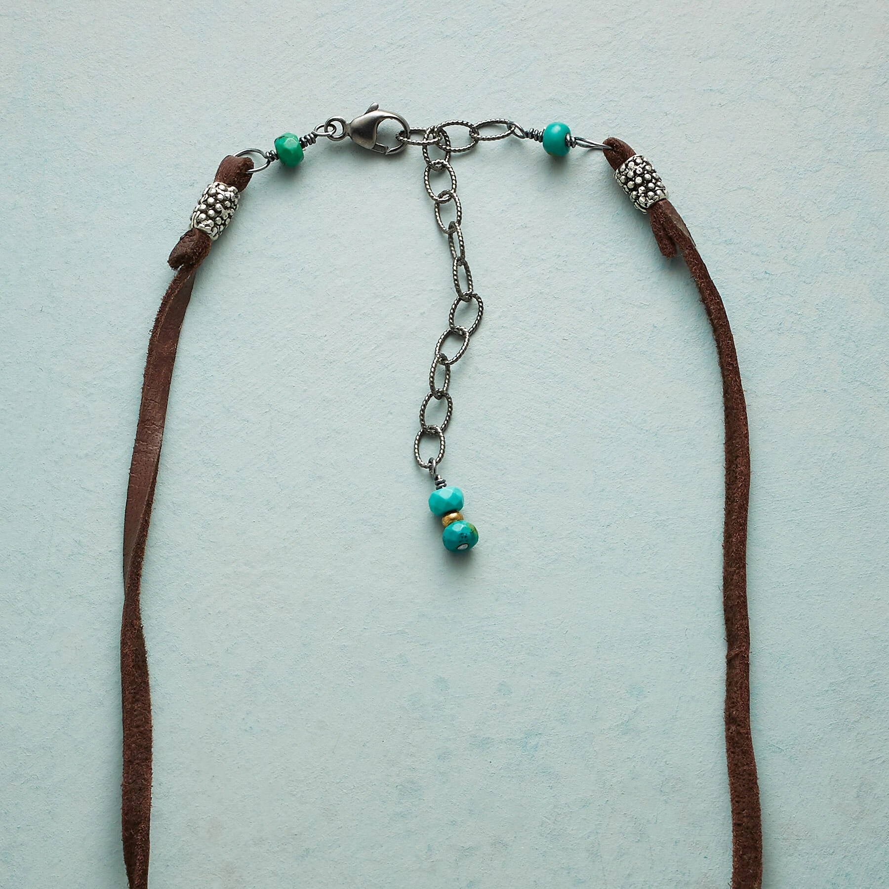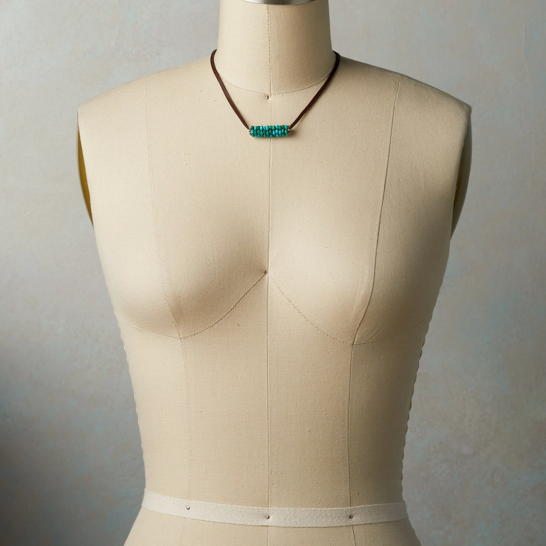 A beaded barrel of turquoise showcases seemingly infinite shades of green and blue. Edged with bright metal African cube beads, it swings from soft chocolate leather. Sterling silver lobster clasp. Handmade in USA. 16″ to 18″L.