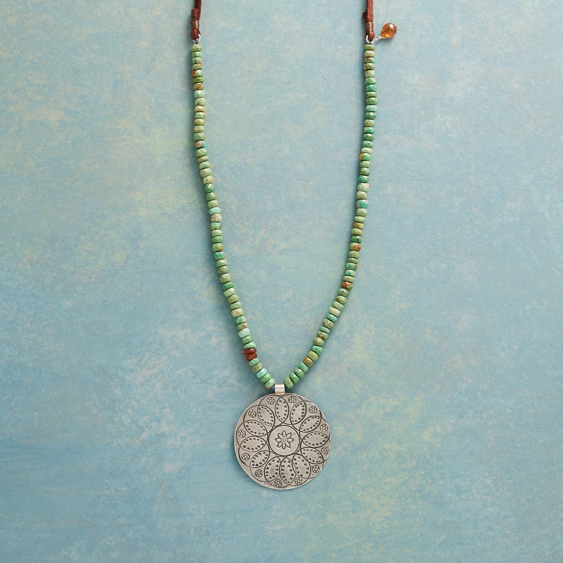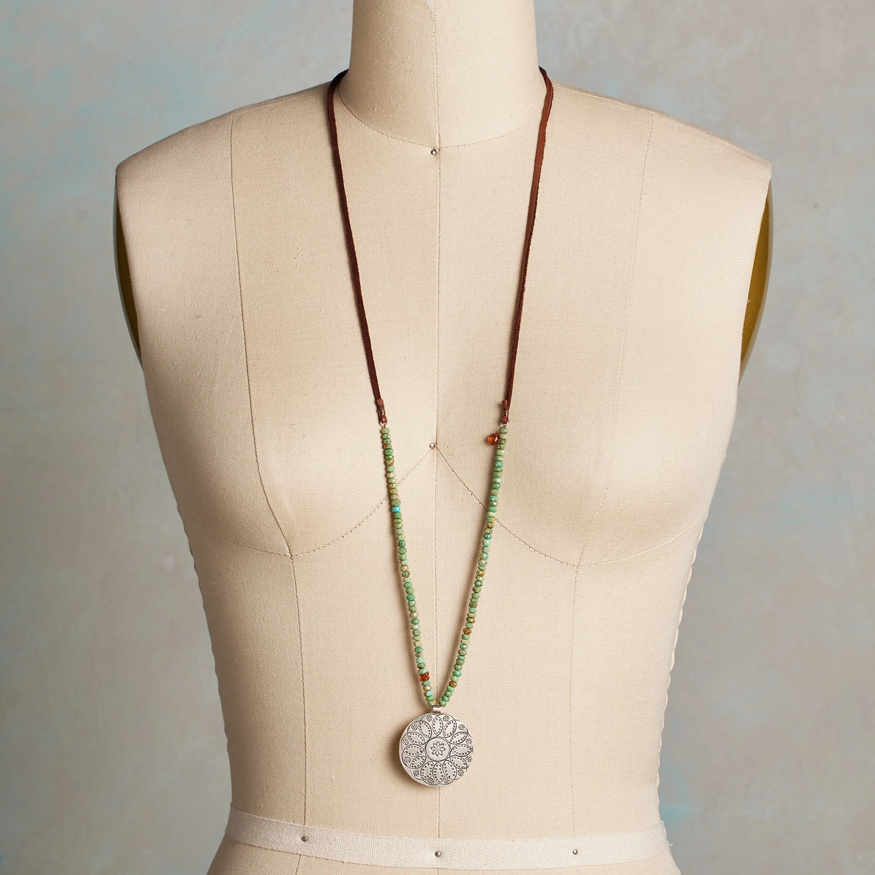 Orange garnet sparks amid cool blue turquoise anchored by a sterling silver mandala. Leather laces with a Hill Tribe silver slider let you wear this piece long or short. Handmade in USA. Exclusive. 12″-50″l, 1-1/2″ drop.
