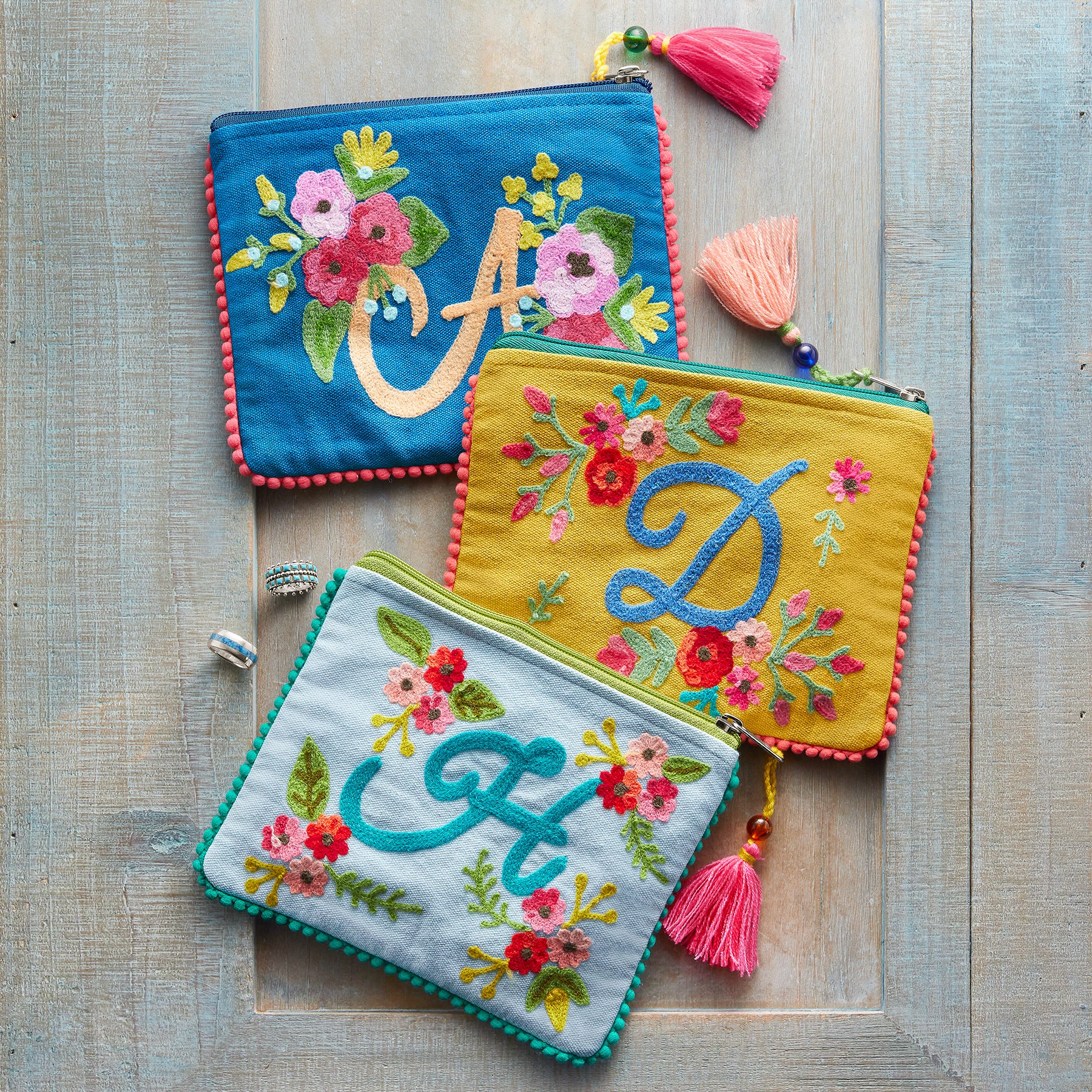 Edged with bubbly ball trim and embroidered with blooms, these personalized cotton canvas pouches are bright, cheerful and exceptionally handy. Perfectly sized to hold jewelry or make-up or keep essentials organized in your purse, they close with tasseled zippers. Imported. 8″W x 6″H.