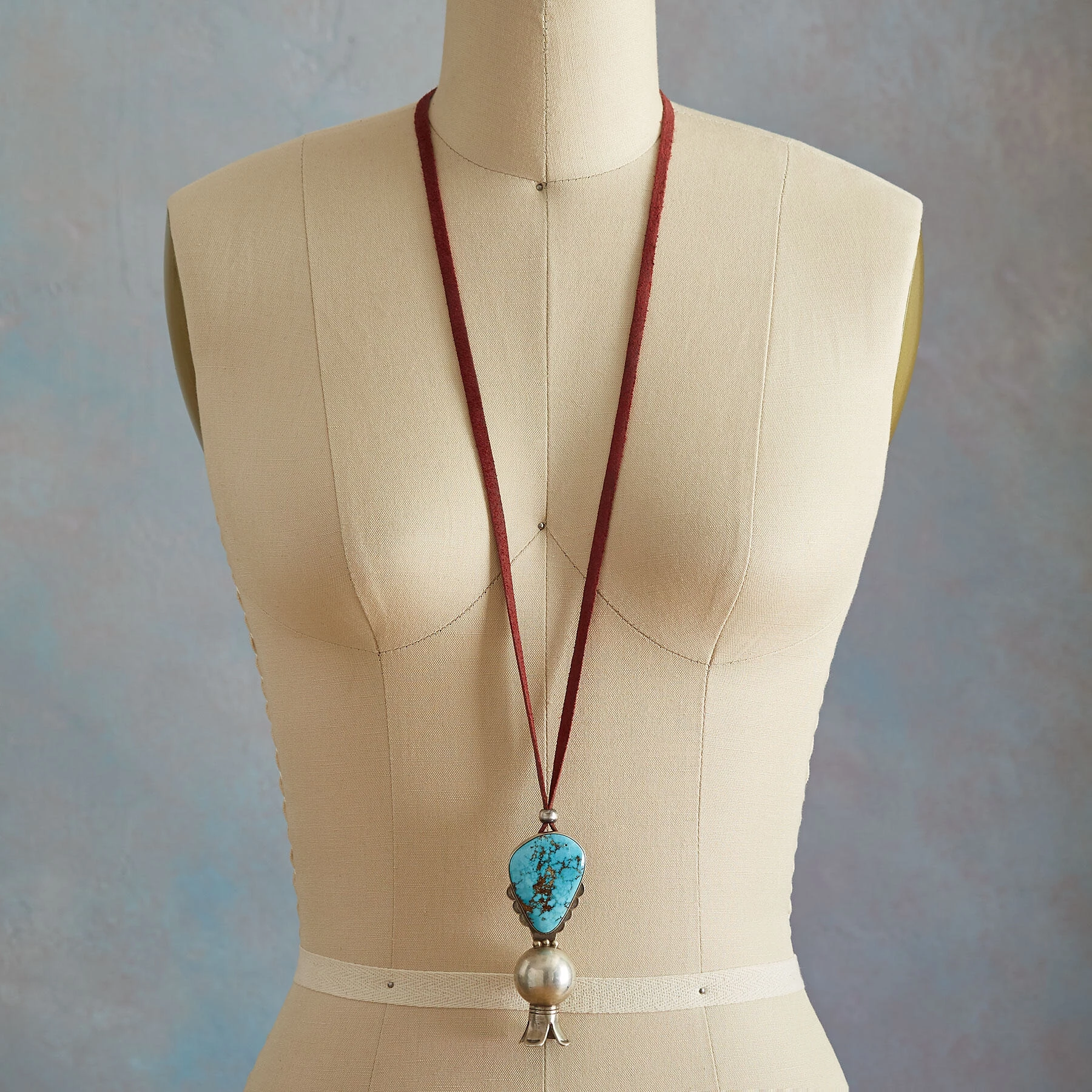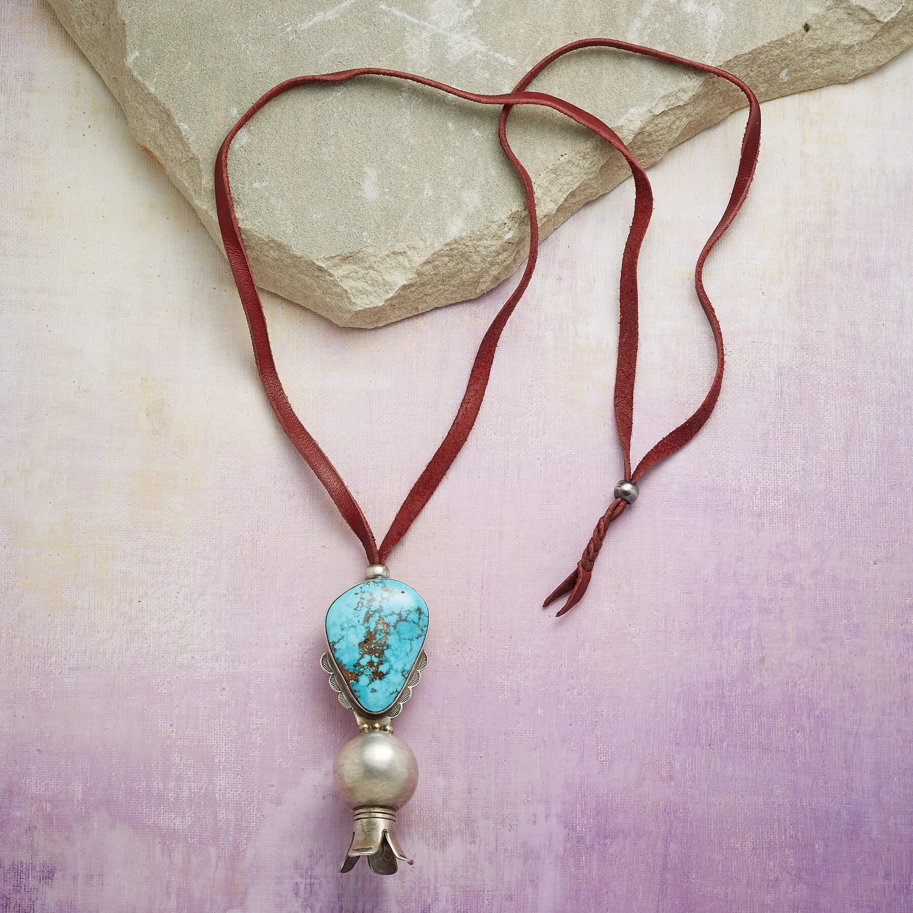 The artist Jesse Robbins focuses on one of the most iconic of Native American jewelry symbols โ the squash blossom, handcrafting it in sterling silver and crowning it with a stunning turquoise from Nevada’s Cheyenne Mine framed in hand-cut, scalloped sterling. Leather cord; sterling silver slider beads. Made in USA. One of a kind. 32″L; 3-5/8″L x 1-1/4″W pendant blossom.