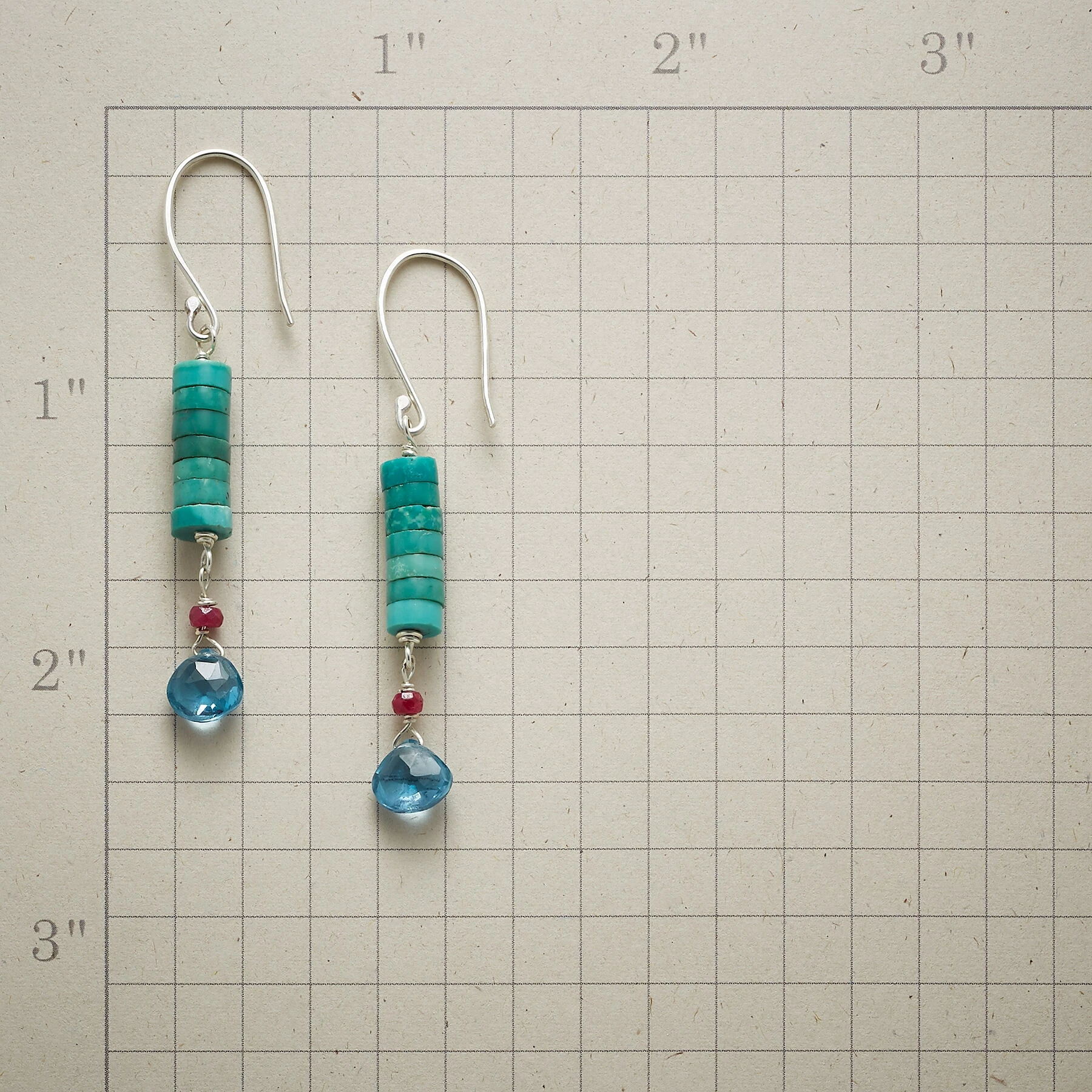 Heishi beads of composite turquoise fall into line above a tiny ruby corundum and sparkling London blue topaz. Exclusive. Handmade in USA of sterling silver. French wires. 2-1/4″L.