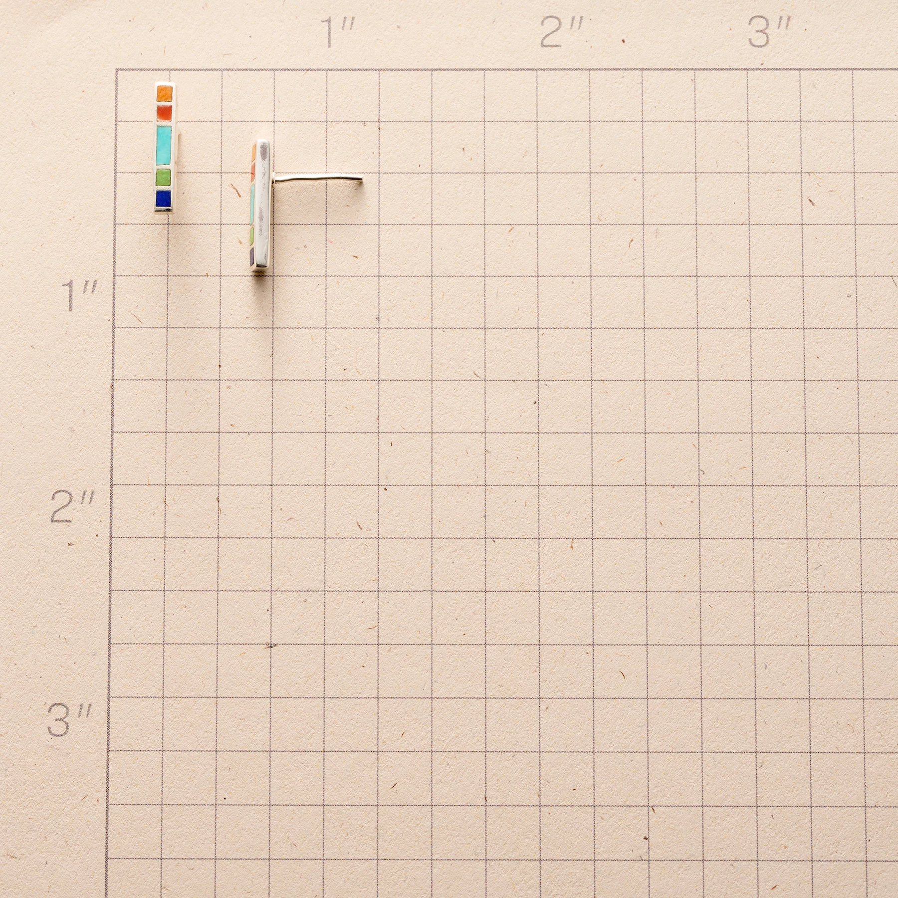 Expertly inlaid spiny oyster shell, coral, turquoise, gaspeite and lapis promenade down petite sterling silver bars. Posts. Handcrafted. Exclusive. 5/8″L.